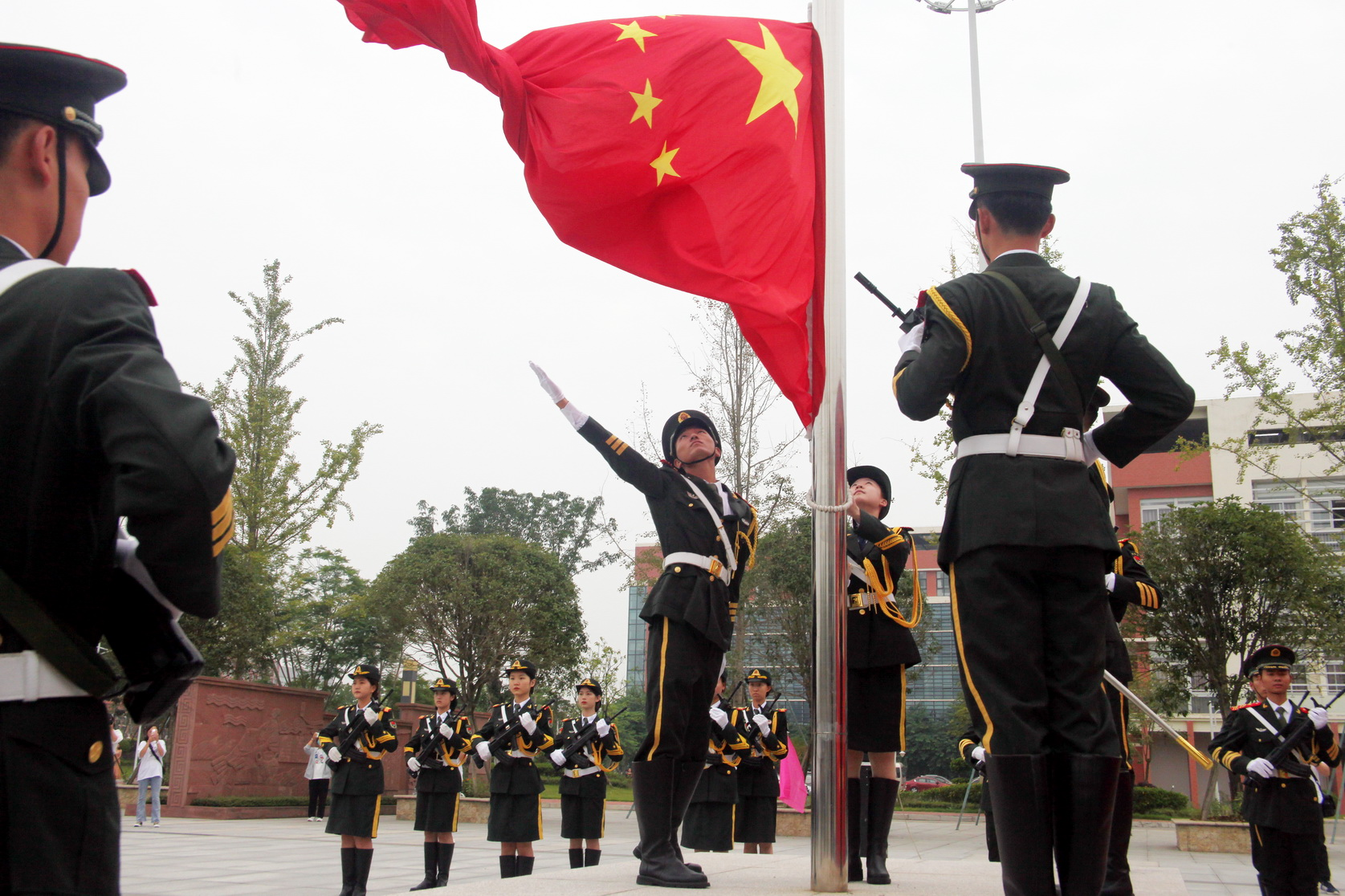 伴随着嘹亮的口号声,护旗队迈着整齐的步伐,护送国旗到达升旗台。在雄壮的《义勇军进行曲》中,全体人员对国旗行注目礼,目送鲜艳的五星红旗冉冉升起,迎风飘扬。