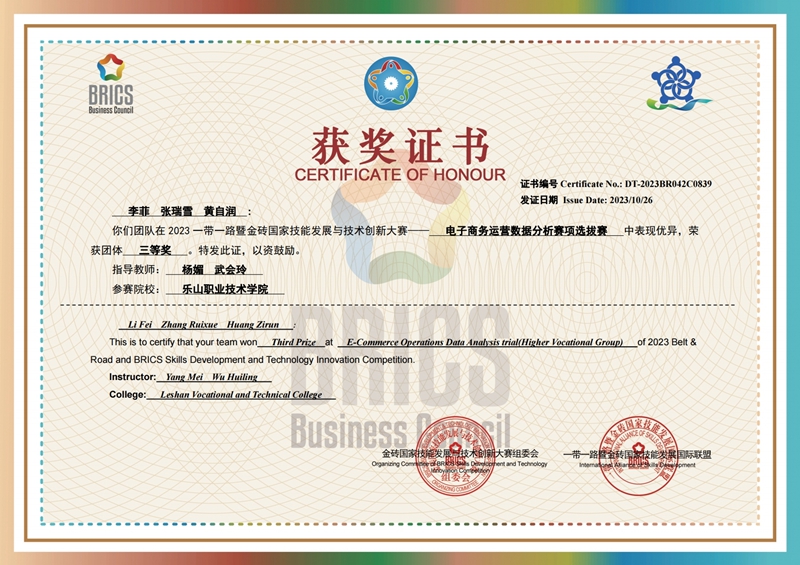 2023年10月21-22日,2023一带一路暨金砖国家技能发展与技术创新大赛电子商务运营数据分析赛项在重庆举行,重庆赛区177所院校333支队伍参与本次预选赛选拔。BV伟德官方网站李菲、唐华莲等6人组建的2支团队参加了此次选拔赛,两支队伍均取得了三等奖。此次赛项由杨媚、武会玲担任指导老师。