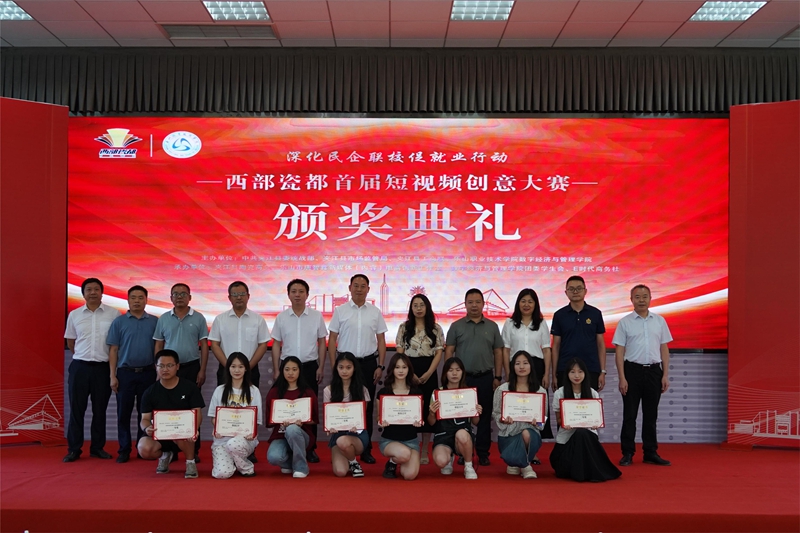 颁奖典礼上,周芹发表了热情洋溢的致辞。她表示,此次大赛是学院与夹江县陶瓷商会深化校企合作的重要举措,通过比赛,不仅提高了学生的实践能力和创新思维,也为夹江县陶瓷产业的发展注入了新的活力。同时,他希望未来双方能够继续加强合作,共同探索更多的人才培养模式和产业创新路径。刘勇也对此次大赛的成功举办给予了高度评价。他指出,短视频作为当下最具传播力的媒体形式之一,为夹江县陶瓷产业的宣传和推广提供了新的机遇。本次大赛的优秀作品将有力地提升西部瓷都的品牌知名度和影响力,吸引更多的人关注和支持夹江县陶瓷产业的发展。