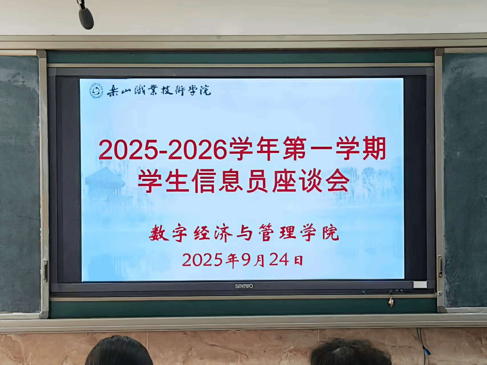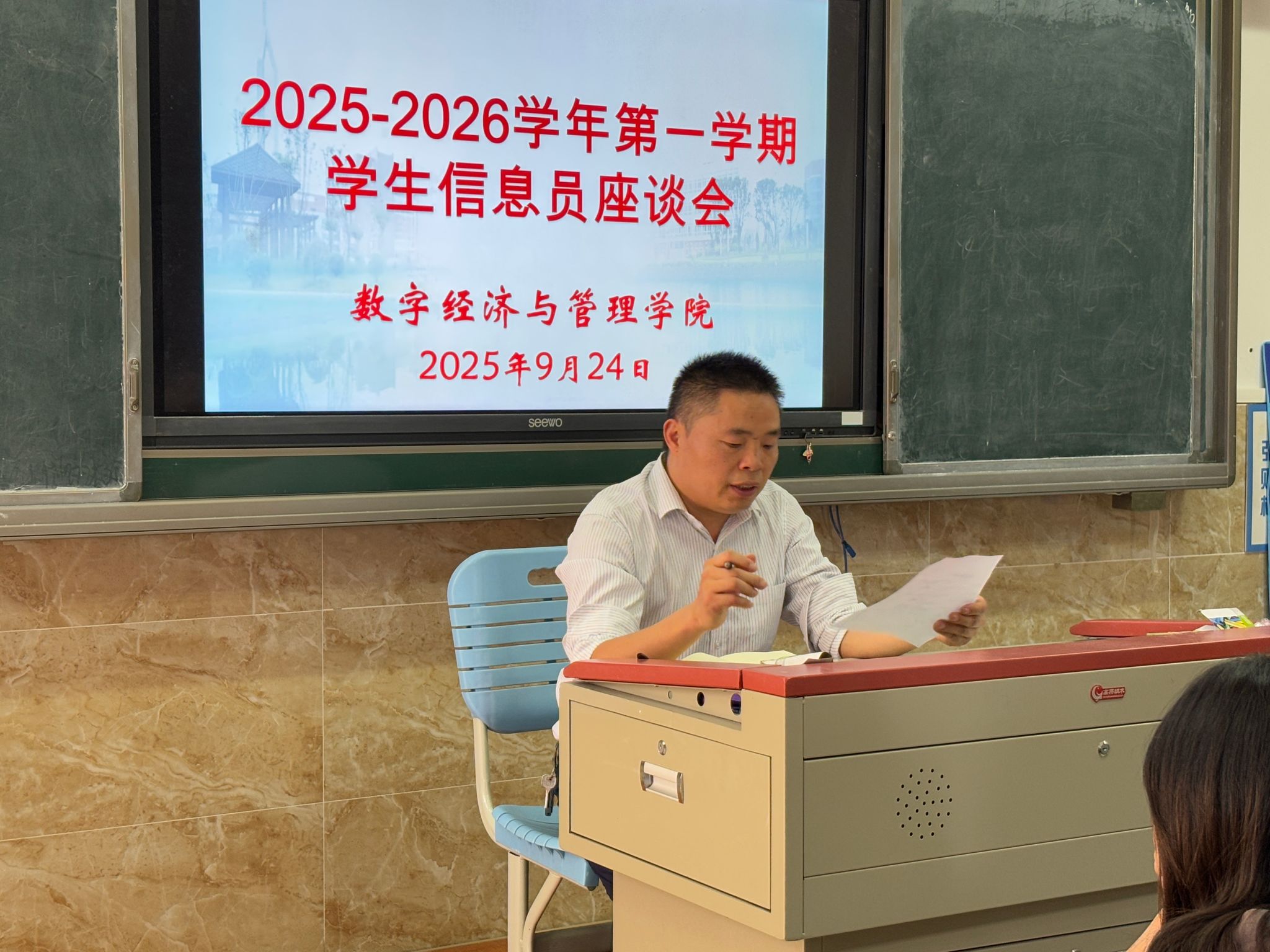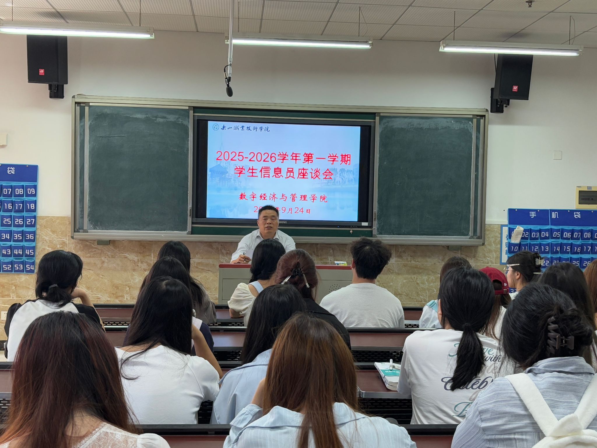 2025年9月24日中午,数字经济与管理学院在教学楼1B404召开9月教学督导信息员座谈会,副院长何瑞、督导干事刘佳敏及各班信息员参与此会议。