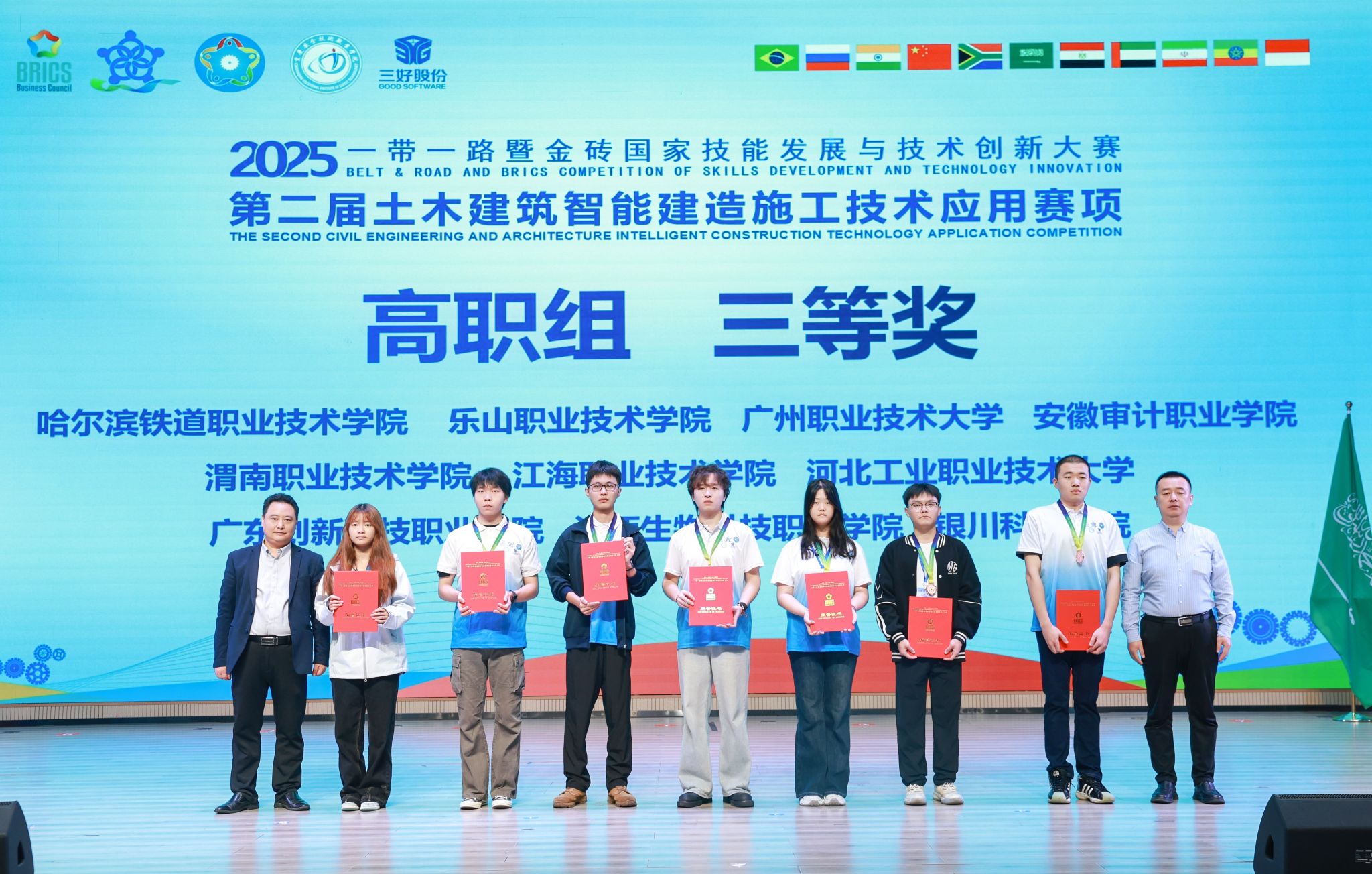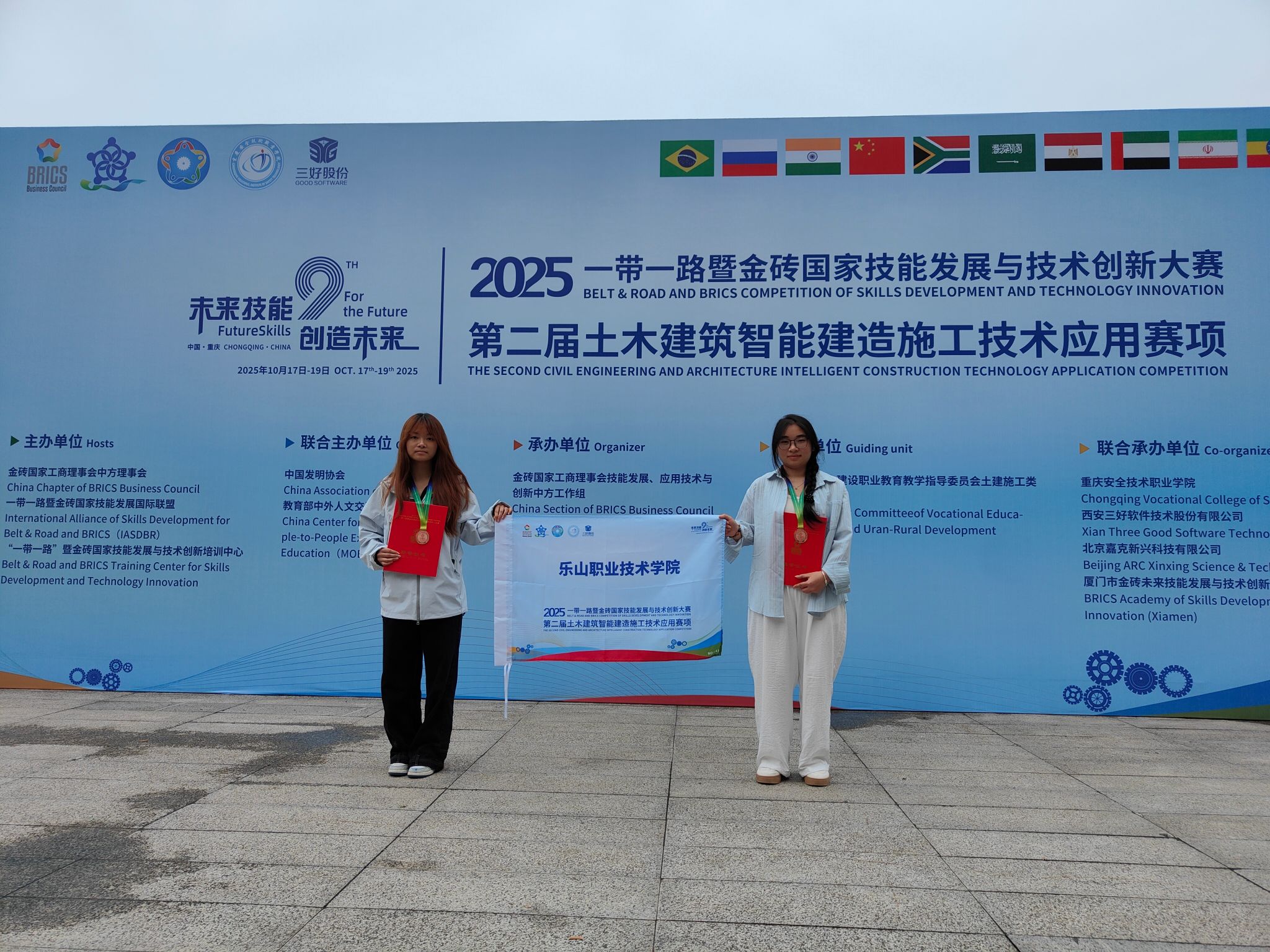 2025年10月17日—19日,2025“一带一路暨金砖国家技能发展与技术创新大赛”第二届土木建筑智能建造施工技术应用赛项高职组决赛在重庆万州落幕。BV伟德官方网站工程造价专业学生唐亚周、苏萍萍组成的学校代表队在区域选拔赛中突出重围,与进入决赛的全国289队选手同台竞技,最终斩获全国三等奖,实现专业在该项赛事上奖牌“零的突破”。