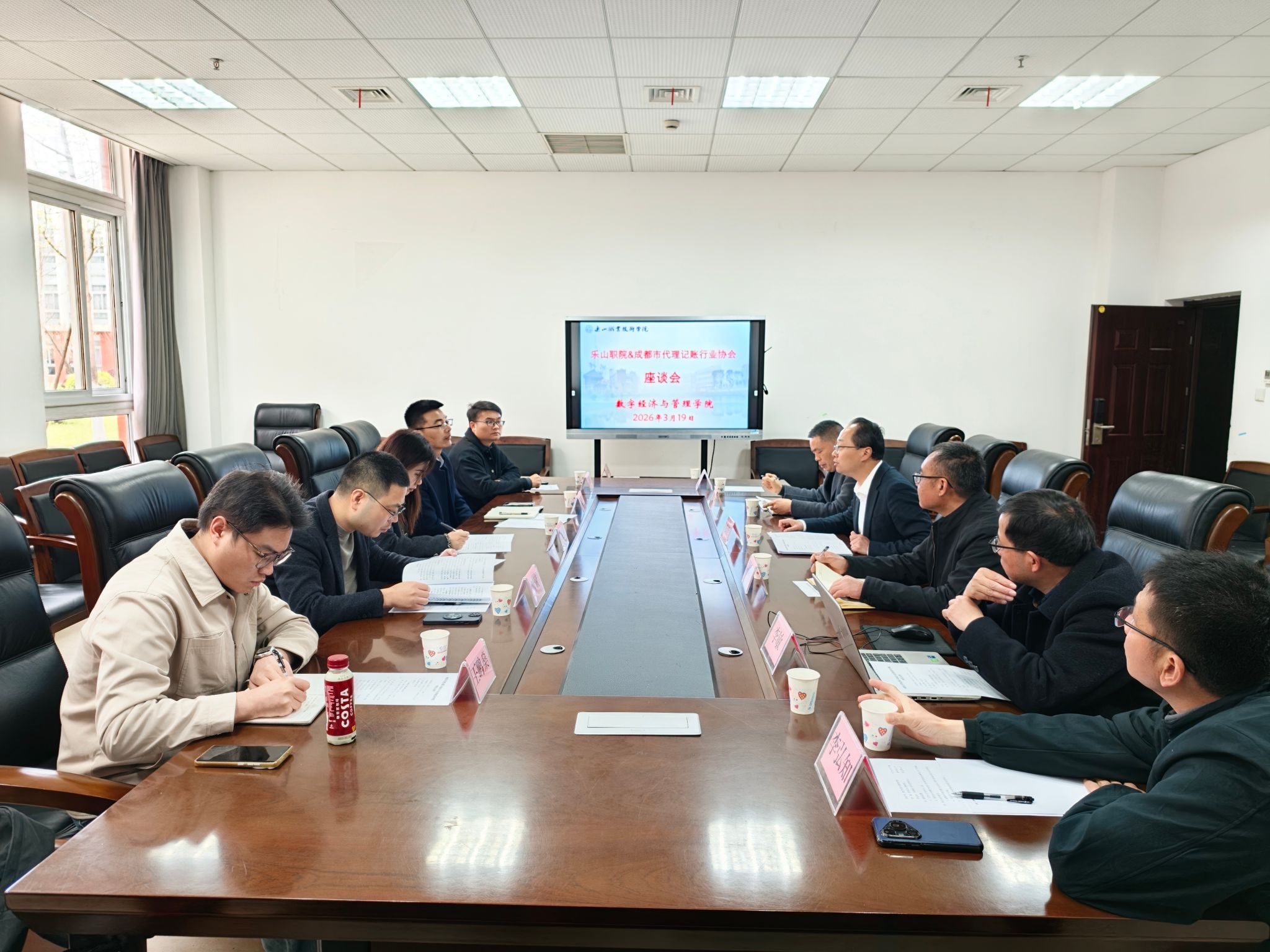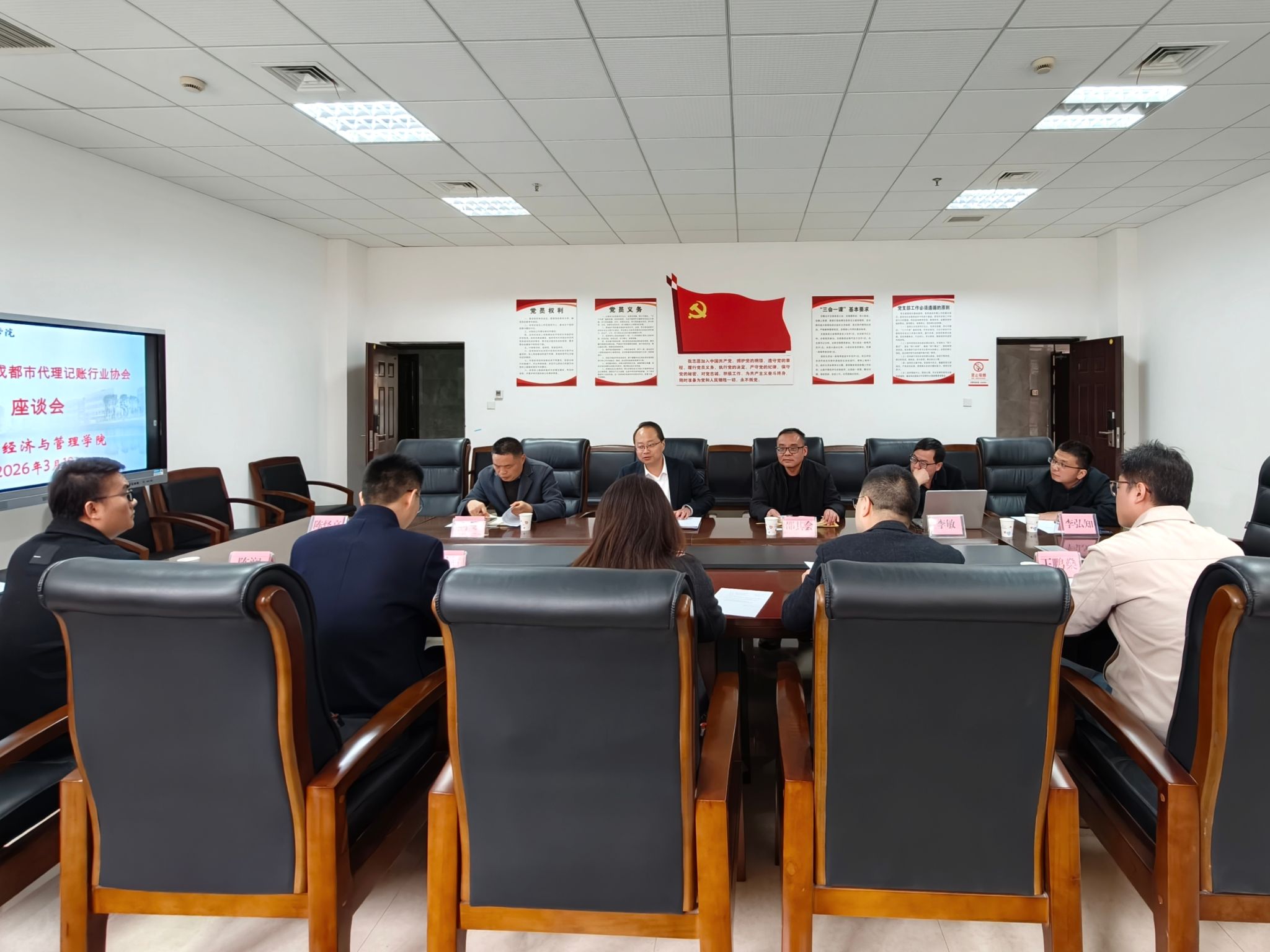 2026年3月19日下午,成都市代理记账行业协会秘书长阳昱杭一行到访BV伟德官方网站,就深化校企合作、共建智慧财税产业学院、推动毕业生高质量就业等议题开展交流座谈。学院党委副书记张佳,数字经济与管理学院院长邵其会及相关教师参加座谈会并陪同调研。