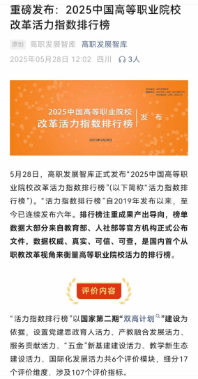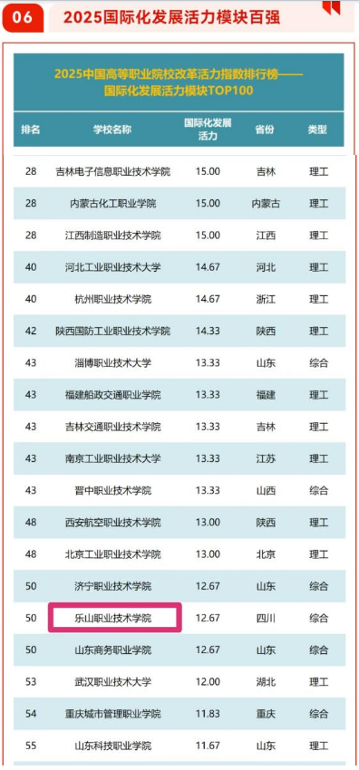 5月28日,高职发展智库正式发布了“2025中国高等职业院校改革活力指数排行榜”。伟德官网凭借在国际化发展方面的卓越表现,成功跻身“国际化发展活力模块TOP100”,位列第50名,在四川省内高等职业院校中表现亮眼。