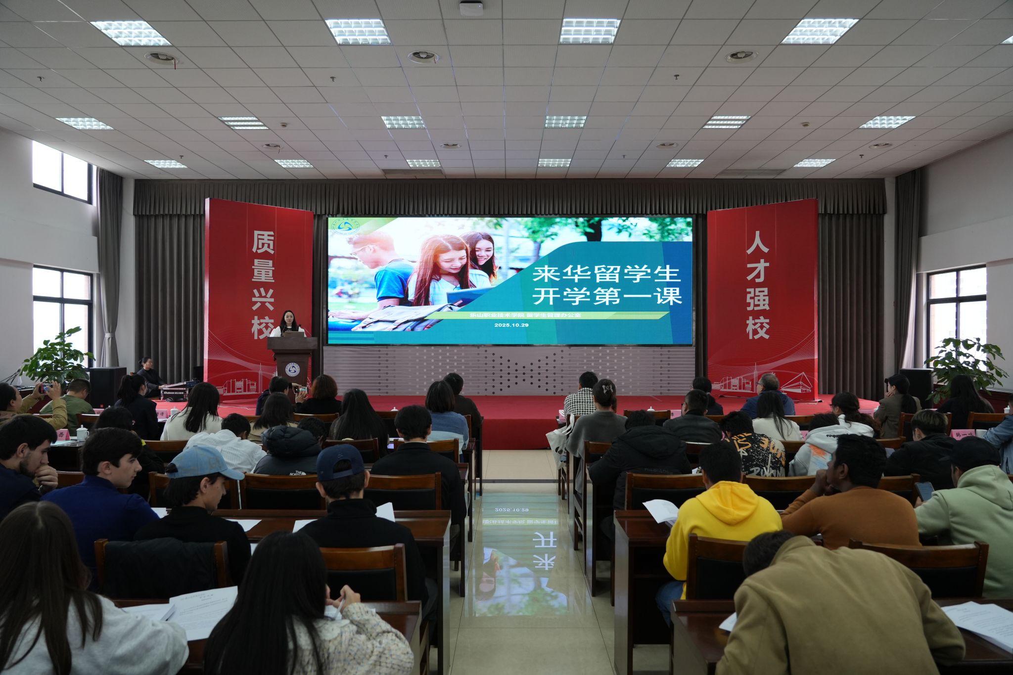20251029日,BV伟德官方网站在学术交流中心为2025级来华留学生隆重举行开学第一课暨入学教育活动。活动由国际交流合作处副处长张晶晶主持,乐山市中区出入境管理大队、学校各职能部门负责人及全体新生辅导员共同参与,为留学生新生提供了全面系统的入学指导。