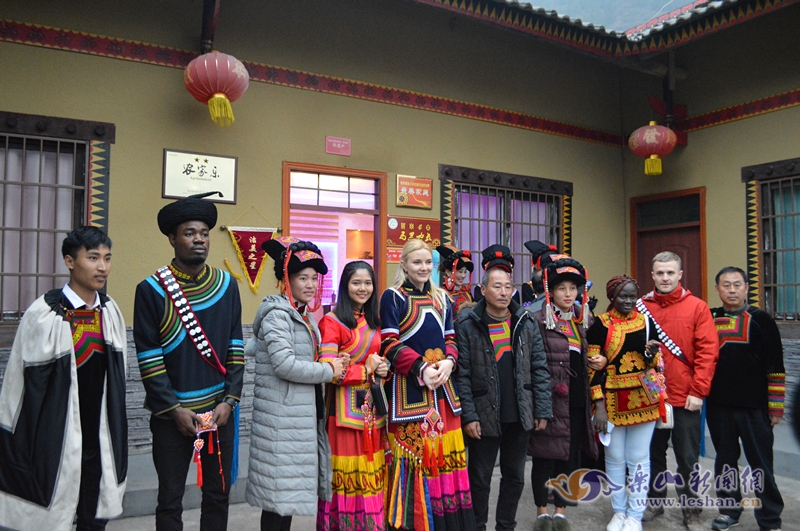 吃过彝家菜,走进彝家寨。随后外籍师生又来到了黑竹沟镇底底谷村的彝家新寨,在这里他们穿上彝族民族服装,披上了彝族查尔瓦,体验了彝族妇女手工刺绣,当然,最让他们难忘的还是村民一起过了一把彝家结亲。