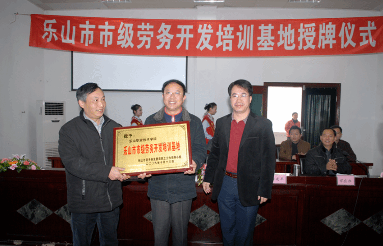 In November 2009, Fang Weijia, then Deputy Mayor of Leshan City, presented the school with the plaque for the “Municipal Labor Export Training Base”.