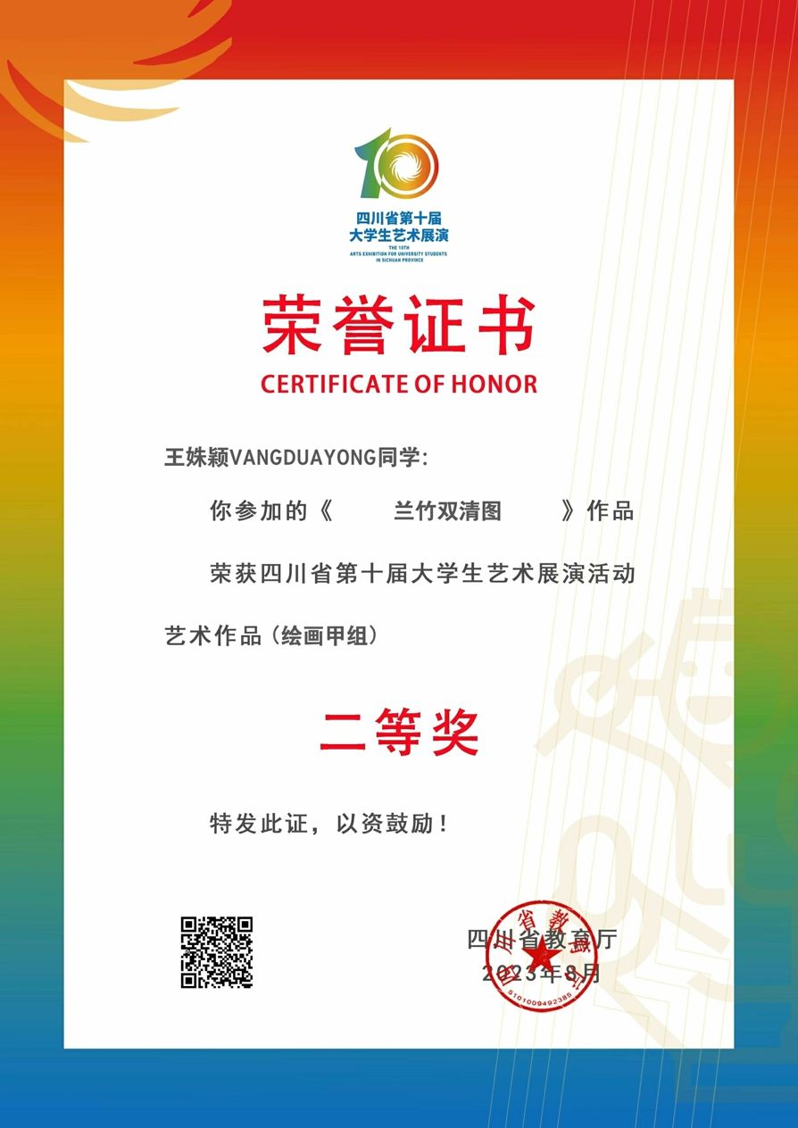 On the evening of August 29th, the 10th Sichuan Provincial College Student Art Exhibition concluded at the Chengdu City Concert Hall. Wang Shuying (Vangduayong) from Laos, a student at our university, won the second prize in the Artwork (Painting Group A) category with her painting titled "Orchid and Bamboo in Harmony."