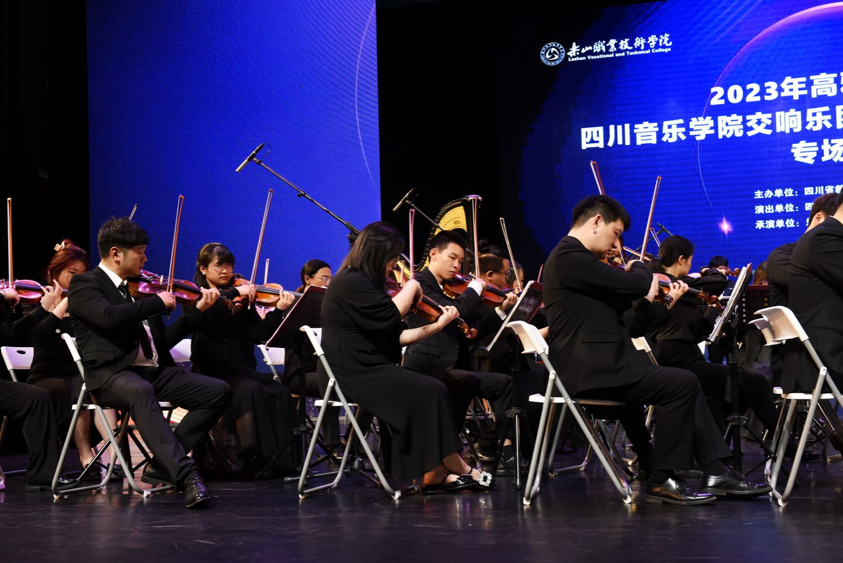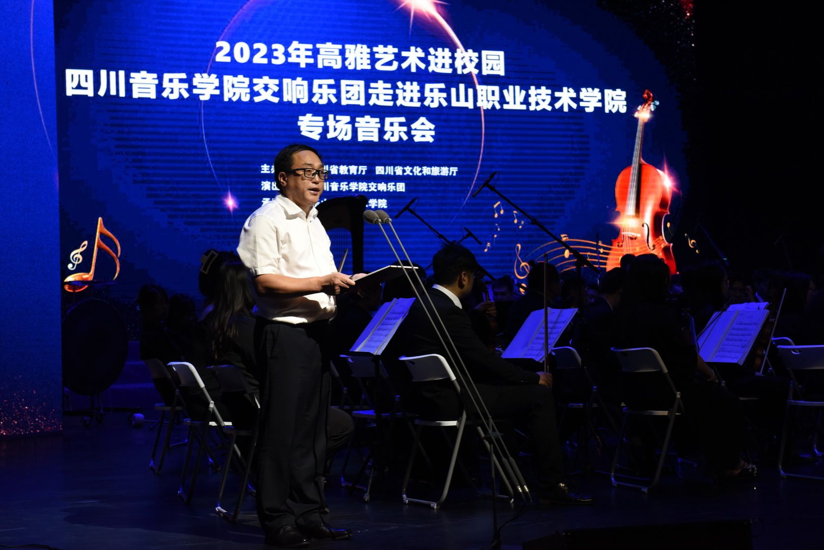 Music conveys the spirit, and art communicates with the world. At 7:00 PM on June 15, 2023, the special concert "Refined Arts on Campus—Sichuan Conservatory of Music Symphony Orchestra at Leshan Vocational and Technical College," co-hosted by the Sichuan Provincial Department of Education and the Sichuan Provincial Department of Culture and Tourism, was successfully held in the college auditorium. Leaders from the Municipal Committee, the Standing Committee of the Municipal People's Congress, the Municipal Government, and the Municipal Political Consultative Conference, as well as leaders from various municipal departments and friendly units, were invited to join over a thousand teachers and students of the college in enjoying this musical feast. Cheng Dingbin, Secretary of the College Party Committee, delivered a welcome speech.