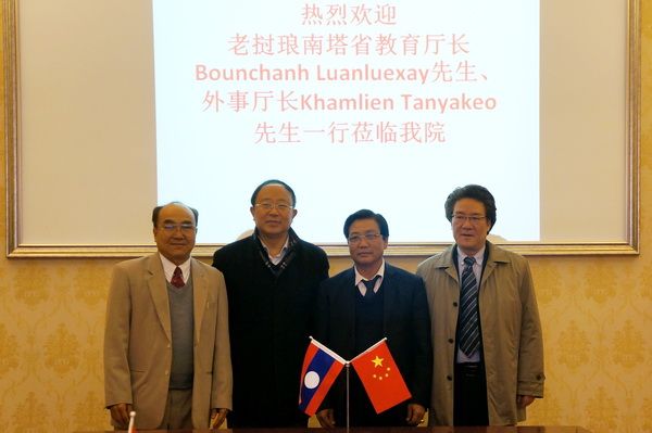 On February 18th, 2014, the Provincial Director of Education, Bounkong Luanglasy, and the Provincial Director of Foreign Affairs, Kongphet Thongyo, from Luang Namtha, Laos, along with the Director of the Education Office of Luang Namtha Province, Thongchanh Aphachanh, visited our college. They were accompanied by Mr. Liao Fei, Deputy Director of the Office International Cooperation and Exchange at Leshan Normal University. Attending the meeting were Dean Xue Jianping, Deputy Secretary of the College Party Committee Chen Zhihai, Director of the Office of International Cooperation and Exchange Huang Xiaoli, and leaders from relevant departments and faculties.