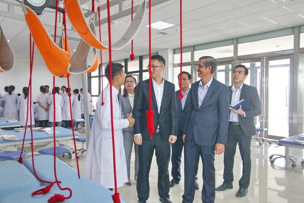 The delegation visited the college's multi - functional training hall, polysilicon production simulation factory, and nursing training room. They learned about the college's scale, development, major training, and talent cultivation. They observed emergency and rehabilitation therapy classes and exchanged views with teachers on professional training equipment.