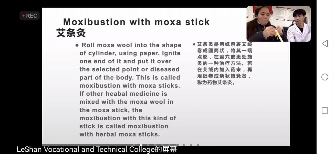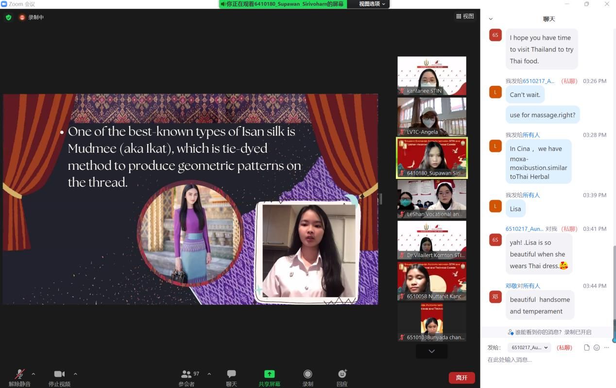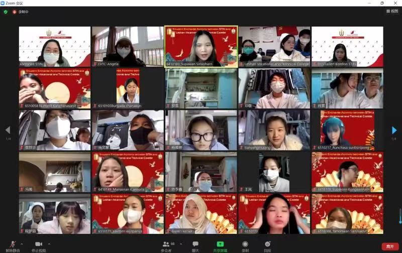 The event consisted of two parts. Firstly, students from our college's nursing major virtually guided the Thai teachers and students on a tour of Leshan through the cloud, allowing them to experience the local cultural landscape. Using our college's nursing department as a base, they provided a comprehensive introduction to the college and the learning and living conditions of nursing students. Teacher Yang Qing taught a visually appealing Chinese language class to the Thai teachers and students through the TV series "The Charm of the Blue Lotus." Teacher Zhang Hongyu introduced traditional Chinese acupuncture techniques through practical demonstrations and pictorial presentations. In the second part, the Thai teachers and students showcased Thai culture and costumes, and provided a virtual tour of the Thai Red Cross campus to give insights into the learning, living, and internship experiences of Thai students. Students also introduced the process of making Thai massage fragrance pouches through videos. The event reached its climax when both sides learned Thai language together, with a lively atmosphere filled with laughter and joy.