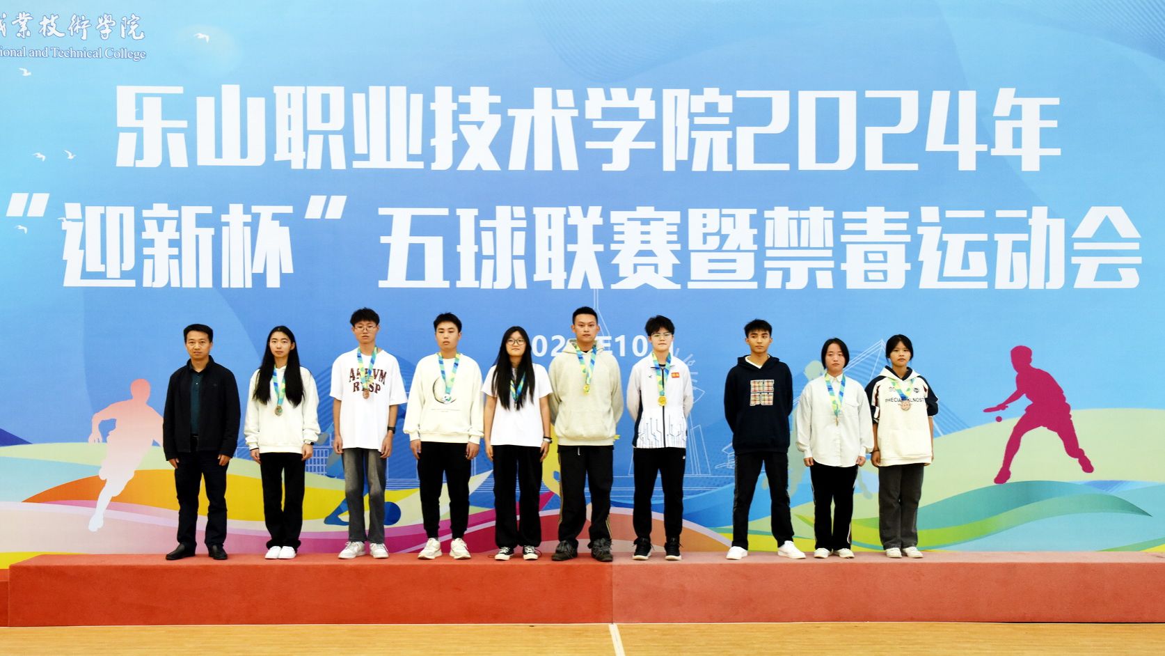 On the afternoon of October 30, 2024, the award ceremony for Leshan Vocational and Technical College's 2024 "Welcome Freshmen Cup" Multi - Ball League and Anti - Drug Sports Meet was held in the gymnasium. Cheng Dingbin, Secretary of the School's Party Committee, attended and announced the end of the sports meet.