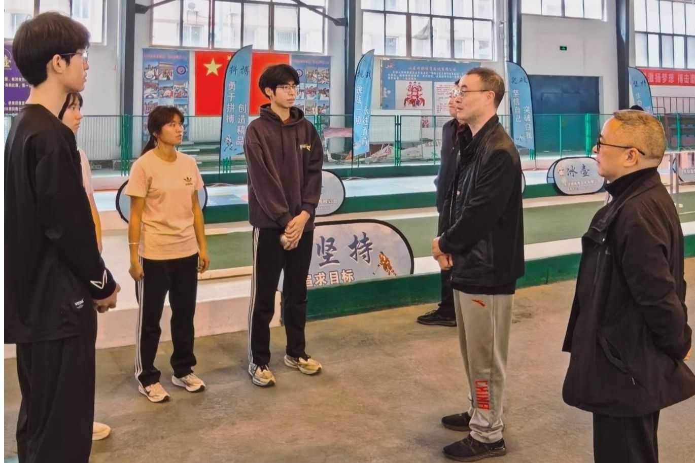 On March 25th, President Liu Zhong led a delegation to the National Petanque Training Base in Yanggu County, Shandong, for an inspection and exchange visit. They discussed cooperation matters and visited four students from Leshan Vocational and Technical College who are currently in training, inquiring about their daily training and living conditions. Zhang Xuehe, a member of the school's Party Committee and vice president, also participated in the inspection.