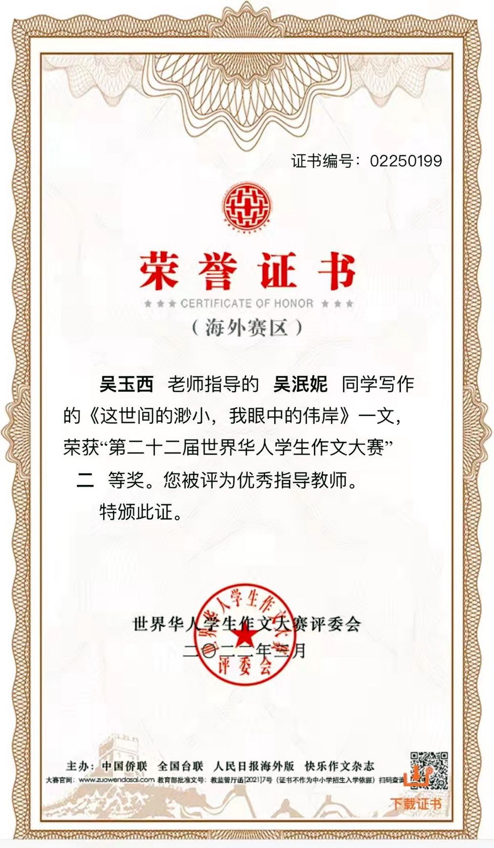 The 22nd World Chinese Students' Composition Contest was jointly organized by the All-China Federation of Returned Overseas Chinese, the Taiwan Democratic Self-Government League, the Overseas Edition of the People's Daily, and the Happy Composition magazine. Since its launch in September 2021, the contest lasted for over six months and attracted more than 3 million Chinese students from 45 countries and regions.