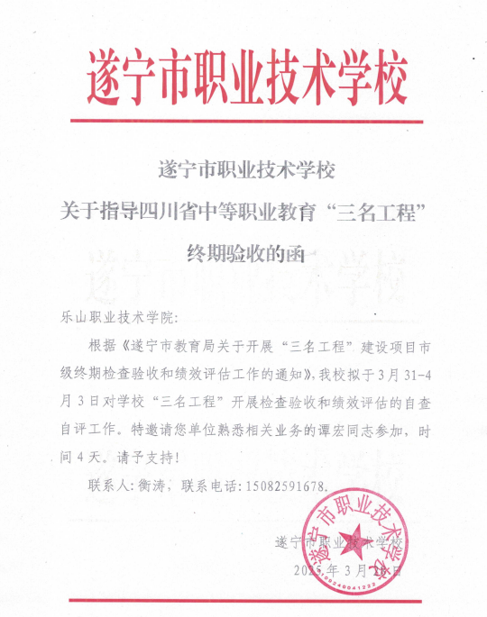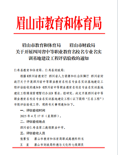 4月16日至17日,受眉山市教育和体育局邀请,作为评估专家组成员,赴仁寿第二职中开展“三名工程”(名校、名专业、名实训基地)评估验收。通过查阅资料、师生访谈、基地考察等方式,在验收的同时提出了一系列改进建议,助力学校高质量通过省级验收。此前的3月31日至4月3日,受遂宁市职业技术学校邀请,就该校“三名工程”迎检工作进行了深度指导。