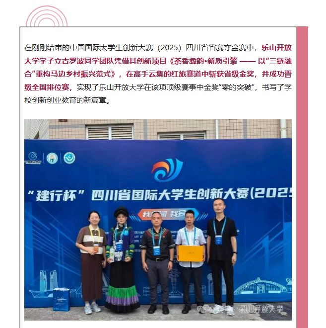作为乐山开放大学专家团队成员,参与指导“茶香彝韵新质引擎——以三产融合重构马边乡村振兴范式”项目,助力其斩获四川省国际大学生创新大赛“青年红色筑梦之旅”赛道省级金奖,晋级全国排位赛。
