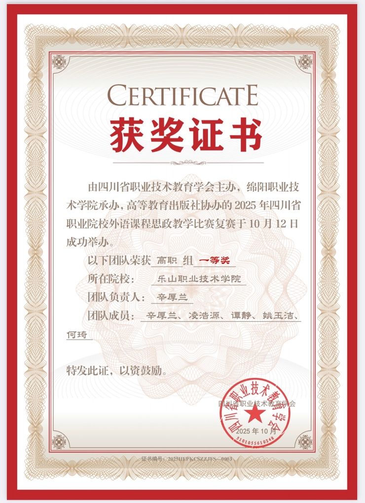 10月12日,2025年四川省职业院校外语课程思政教学比赛决赛圆满落幕。经过激烈角逐,伟德官网素质教育学院英语教师辛厚兰、凌浩源、谭静、姚玉洁、何琦组成的参赛团队凭借其深刻的课程思政内涵、创新的教学设计以及精彩的现场发挥,最终获得高职组一等奖的优异成绩。这一佳绩充分展现了伟德官网在外语课程思政教学改革上的显著成果。