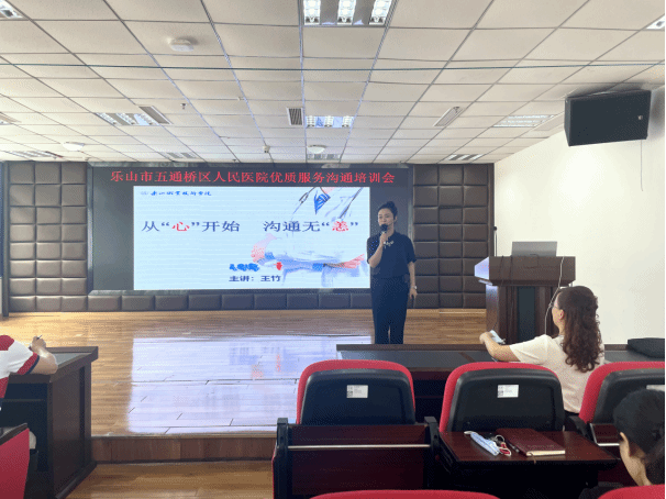 我院人文护理教研室主任王竹老师受邀为五通桥人民医院医护人员进行医疗行业沟通礼仪培训,培训于6月29日下午在乐山市五通桥人民医院学术报告厅进行,共有300余人参加。以“从心开始、沟通无恙”为目标,把培训分为“理论、实训、案例 ”三个项目,集中对五通桥人民医院参培的医护人员进行了一场护理礼仪规范标准系统化训练。