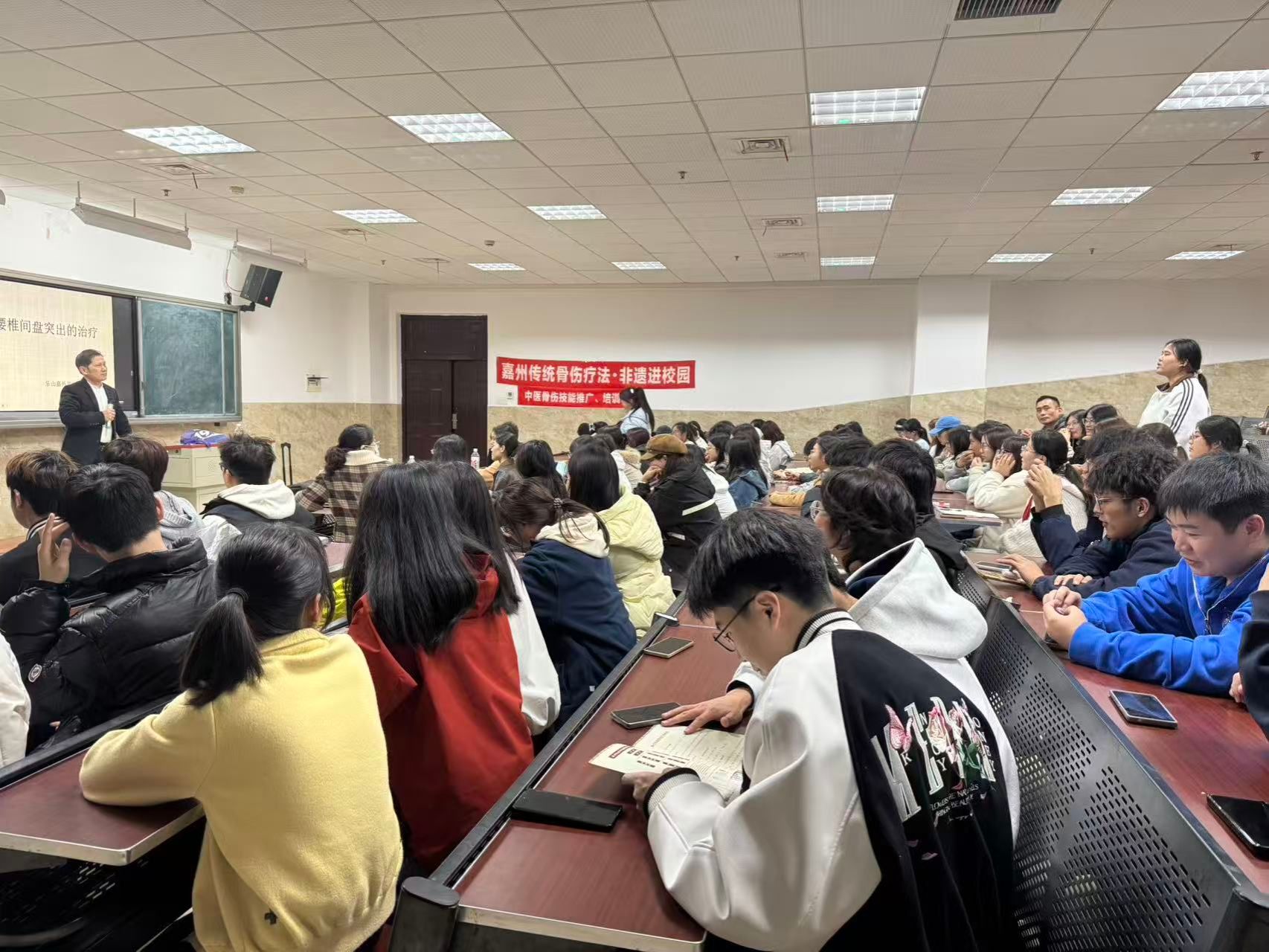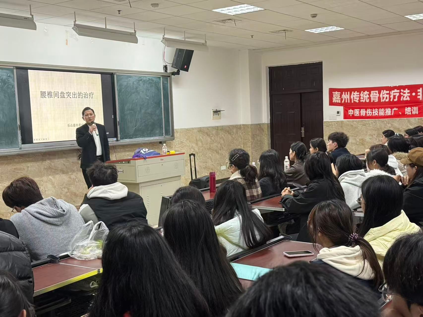 11月16日晚,在BV伟德官方网站学术阶梯教室百余名中医专业大一、大二学生齐聚一堂,聆听嘉州传统骨伤疗法市级非遗代表性传承人叶智勇带来的专题讲座《腰椎间盘突出症的中医诊疗与嘉州骨伤手法实践》。此次活动由乐职院中医教研室发起,张琪,曾晓霞老师共同参与,是学院深化“非遗进校园”校企合作的又一次生动实践。