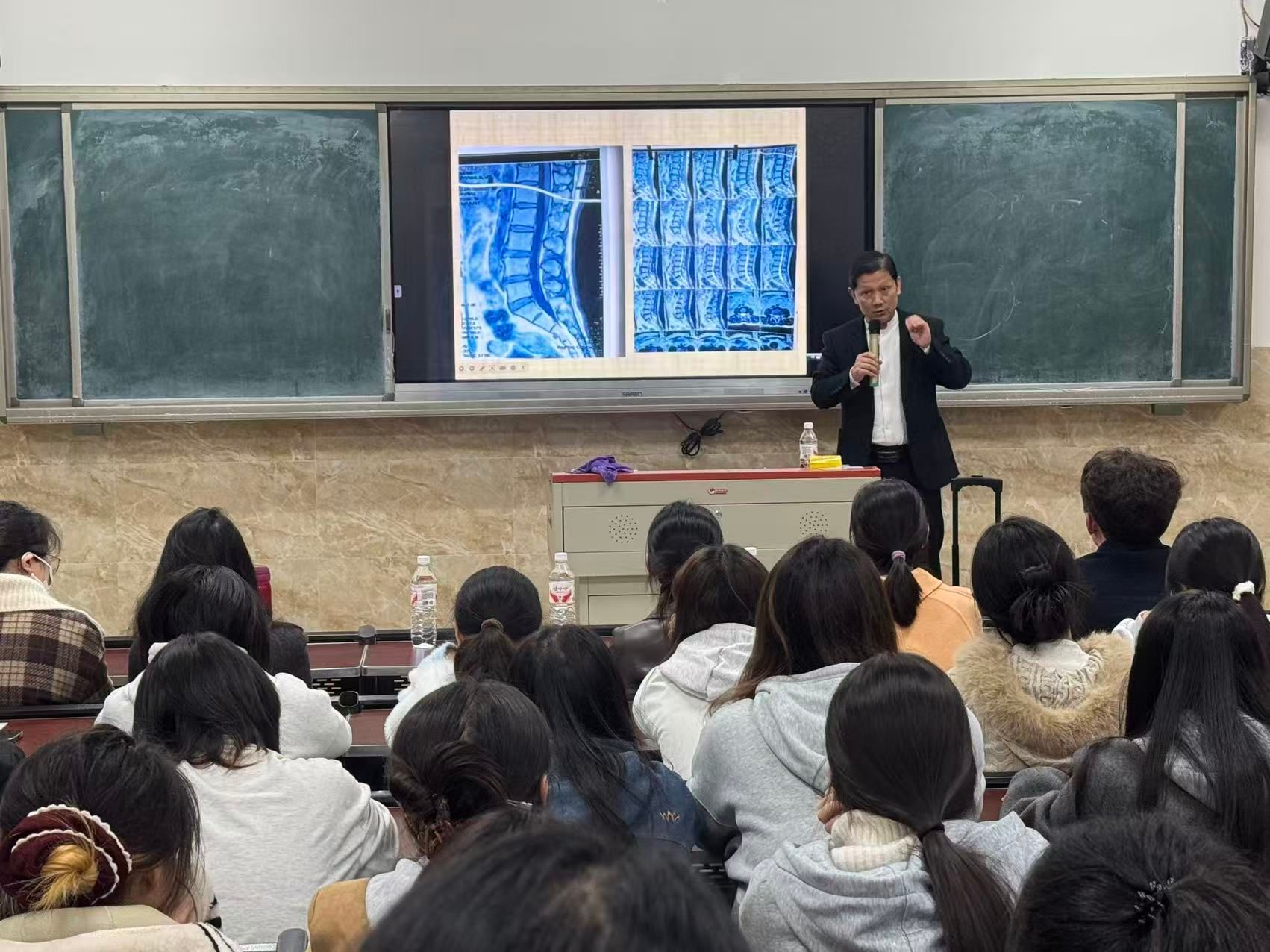 叶智勇先生从“为何学中医、怎样学好中医”切入,结合三十年临证心得,系统讲解腰椎间盘突出症的病因病机、四诊要点及嘉州骨伤“纯手法+中医外治”的诊疗思路。现场播放的病例视频中,一位曾经腰椎摄片显示明显突出的患者在治疗后再次摄片对照突出基本消失,引发同学们阵阵惊叹。“不用开刀、不依赖激素,靠一双手、一根针、一贴药膏,就能让患者重新挺直脊梁,这就是中医的魅力。”叶智勇说。