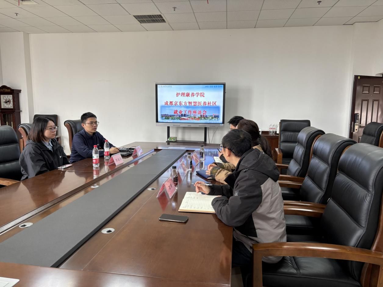 为深入贯彻落实国家职业教育改革部署,进一步推动产教融合走深走实,拓宽协同育人路径,2026年3月16日中午,护理康养学院在二号教研楼301会议室与成都京东方智慧医养社区联合举办访企拓岗促就业座谈会。成都京东方智慧医养社区人事专员张晏祥、照护主管覃瑶琴一行到访交流,学院党总支书记罗健玮、副书记邱科、实习就业科科长郑楠参加座谈。