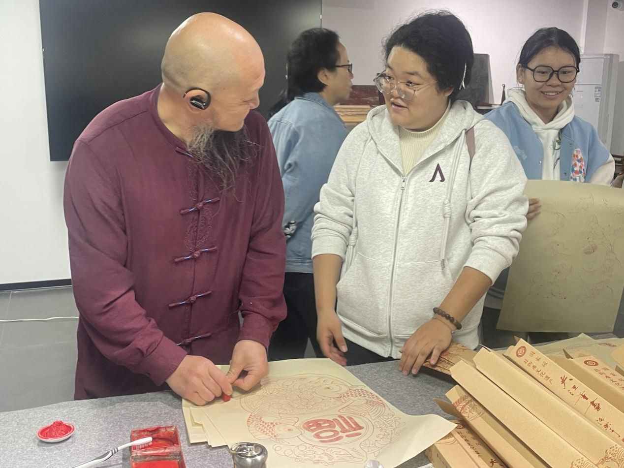 本次研学实践中最受期待的环节,当属年画动手印制体验。在国家级非物质文化遗产夹江年画代表性传承人张荣强老师的亲手示范与细致指导下,师生们积极参与,亲身感受年画印制工艺的独特魅力。从平整铺纸、均匀刷版到精准拓印,每一个操作步骤皆需细致耐心与技巧把控。