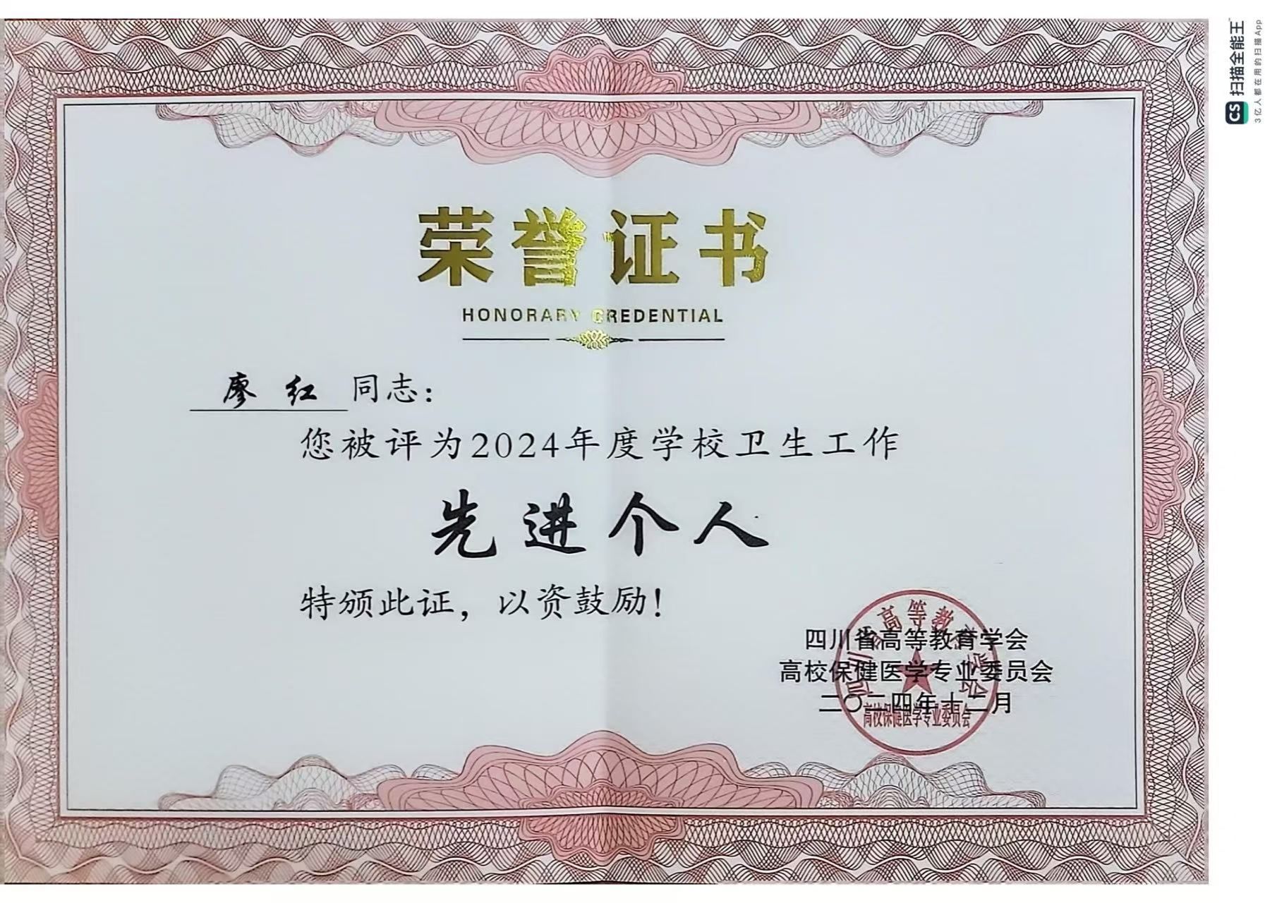 近日,四川省高等教育学会高校保健医学专业委员会对四川大学、电子科技大学等29所高校授予“2024年度学校卫生工作先进单位”,并对32名“2024年度学校卫生工作先进个人”予以表彰。BV伟德官方网站荣获“2024年度学校卫生工作先进单位”,廖红同志荣获“2024年度学校卫生工作先进个人”。
