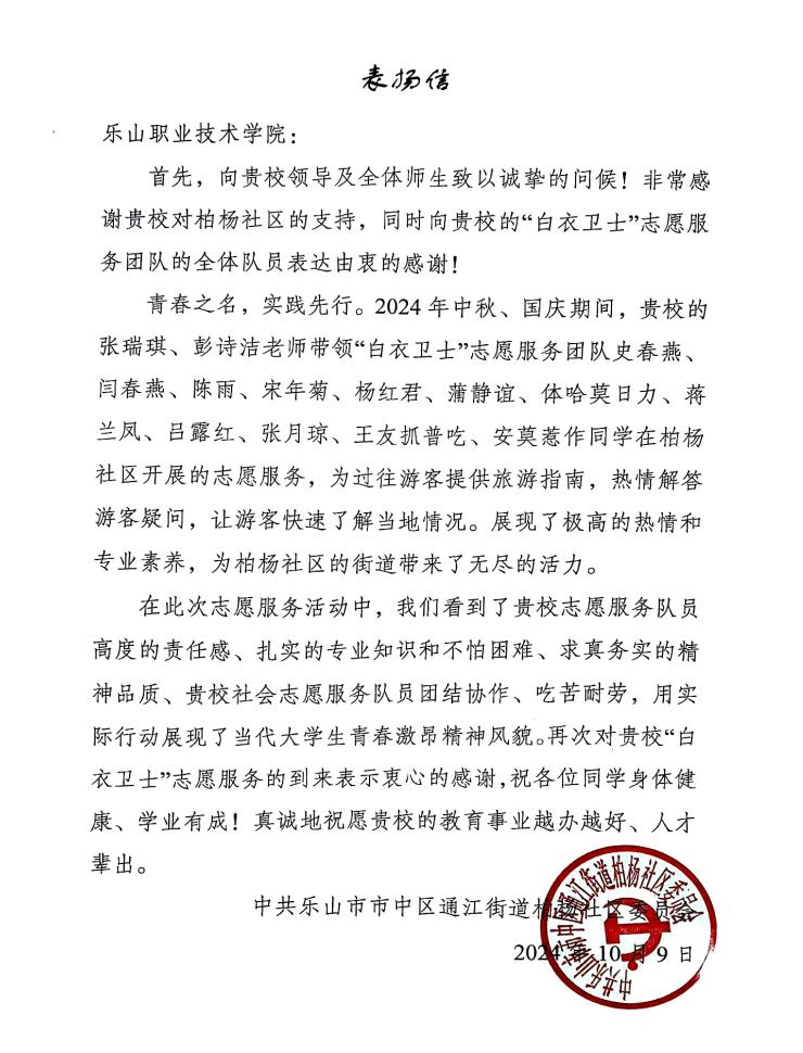 国庆期间,学校团委积极响应共青团乐山市委“青春乐山,爱在社区”青春志愿服务专项行动,组织青协和各二级学院的青年志愿者们参加了乐山市社区“国庆”志愿服务活动。护理学院学生志愿者服务小分队还收到了柏杨社区发来的表扬信,高度赞扬了学生的服务热情和专业素养。
