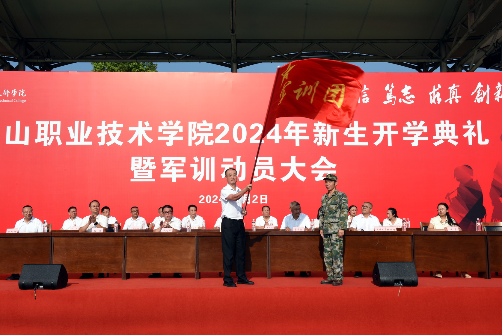 最后,刘忠为军训团执行团长张进阳授军训旗,成定彬宣布“2024级新生军训正式开始”。