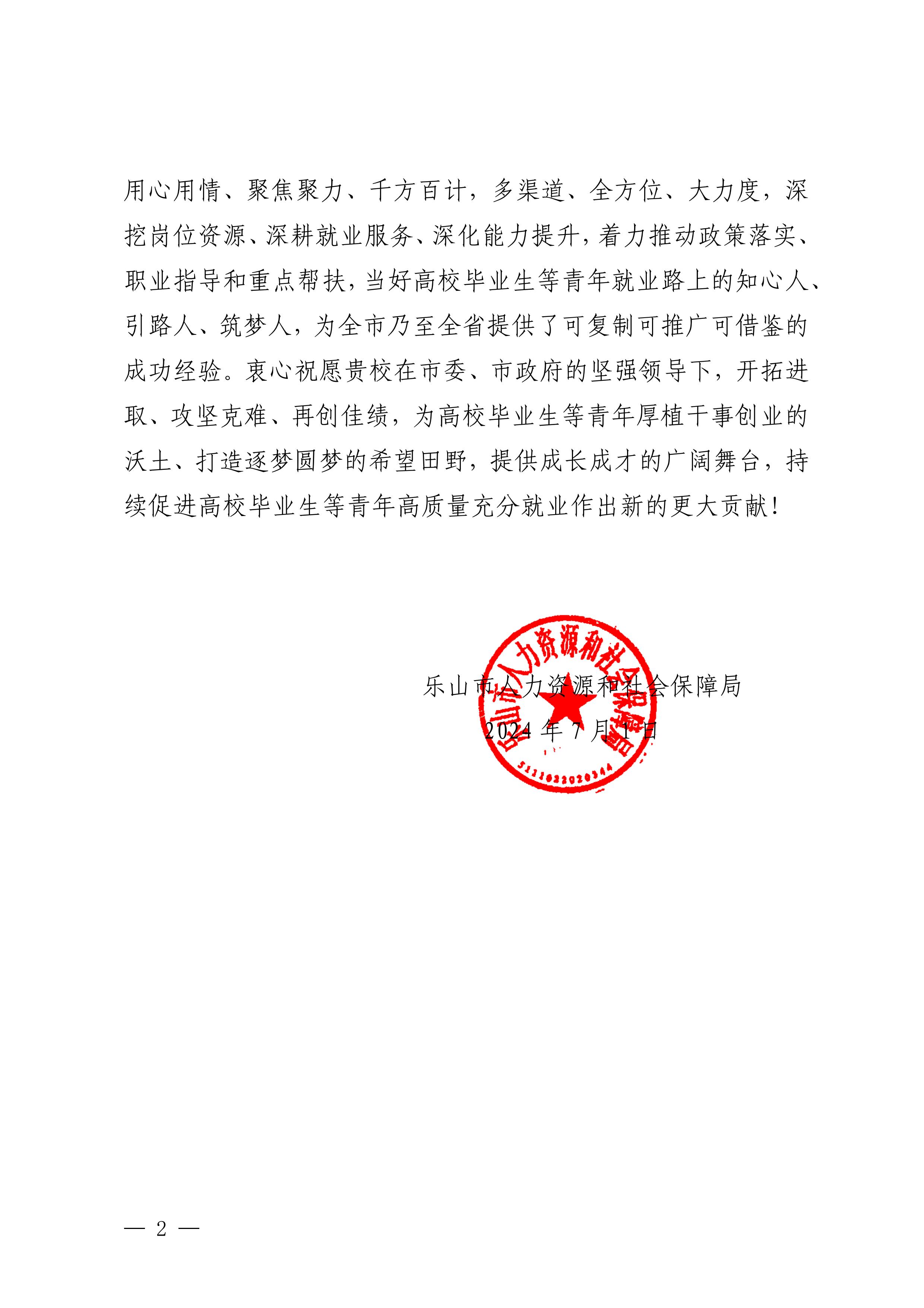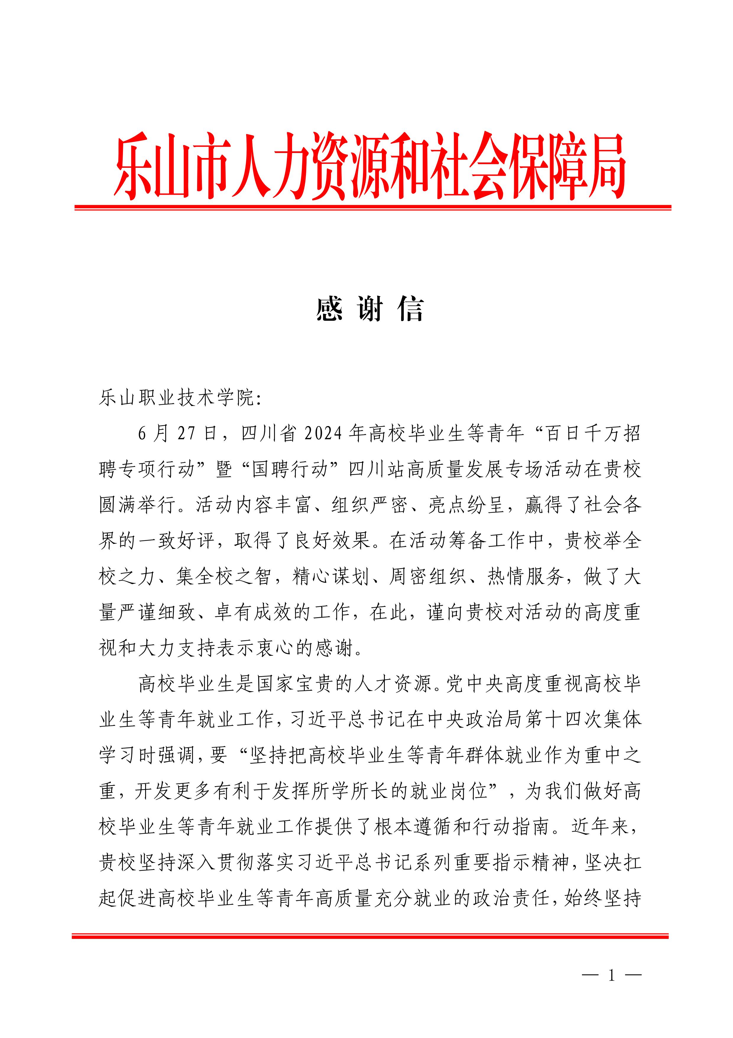 今日,学校收到乐山市人力资源和社会保障局发来的《感谢信》,对学校为四川省2024年高校毕业生等青年“百日千万招聘专项行动”暨“国聘行动”四川站高质量发展专场活动所做的大量工作表示感谢,具体内容如下:
