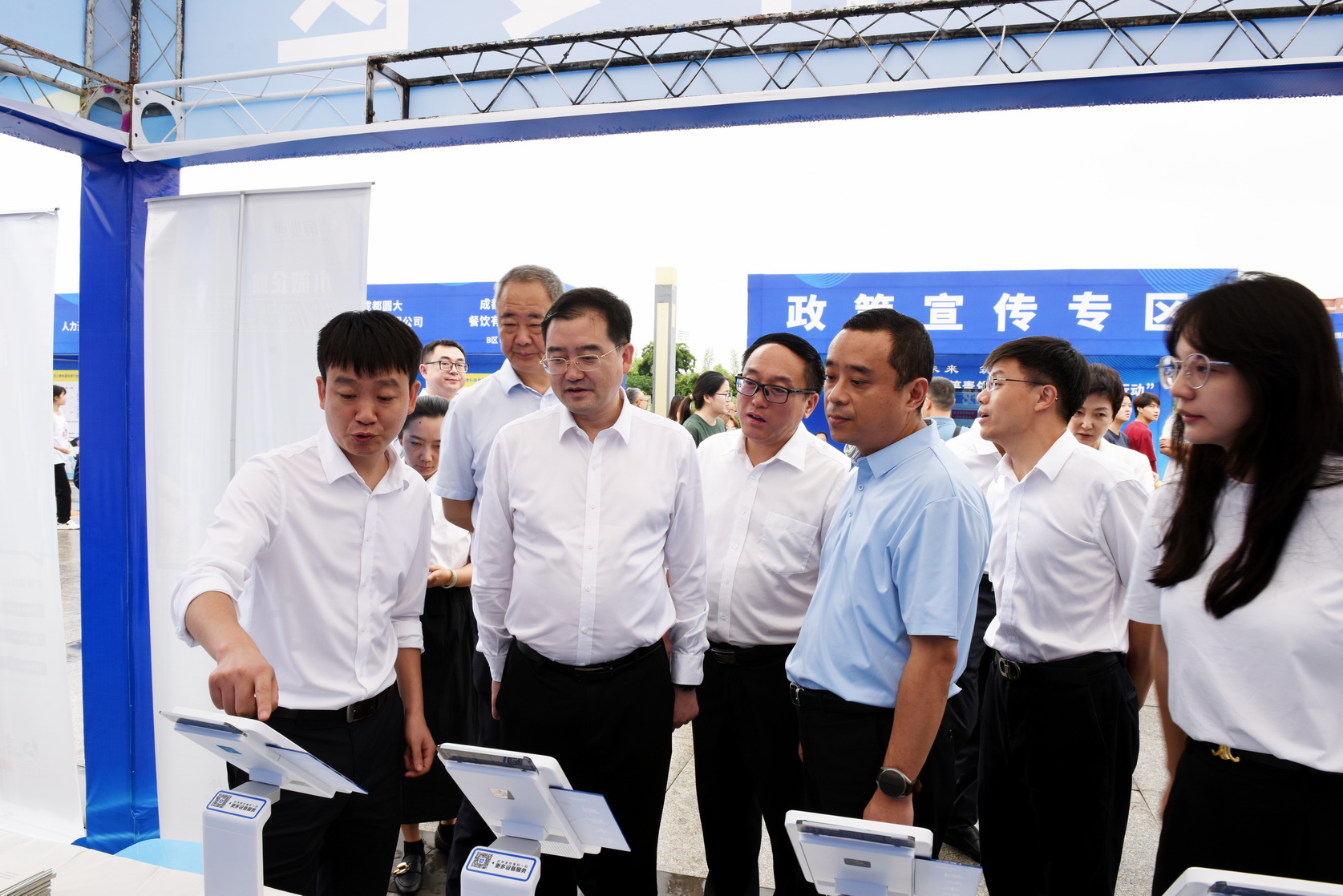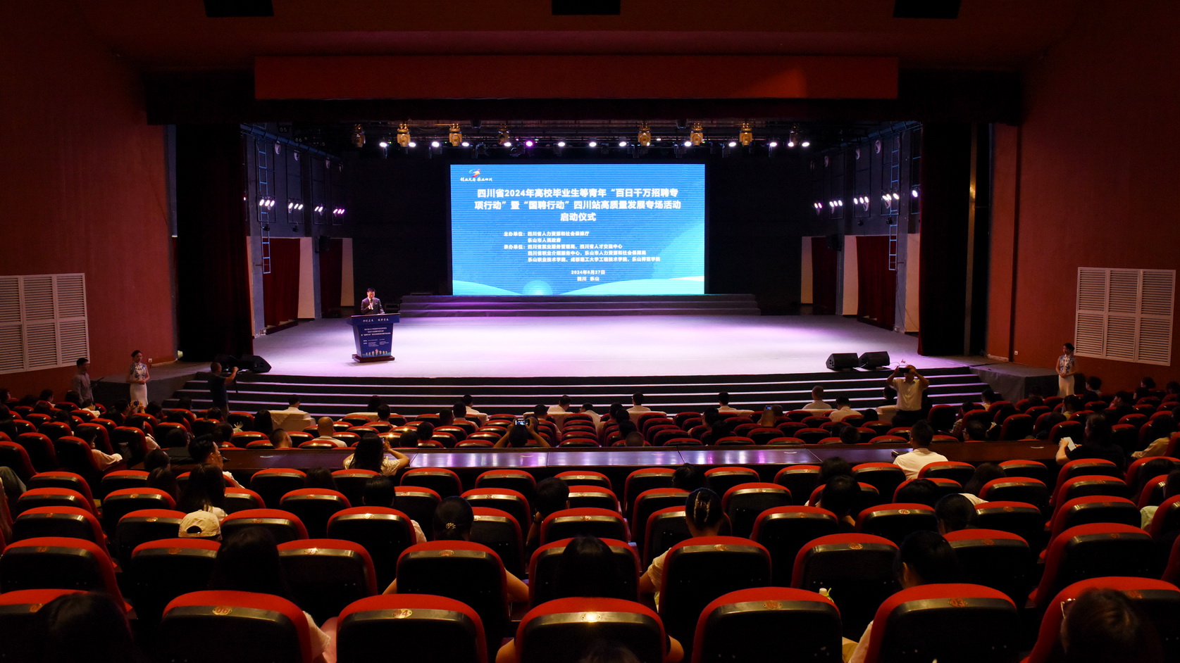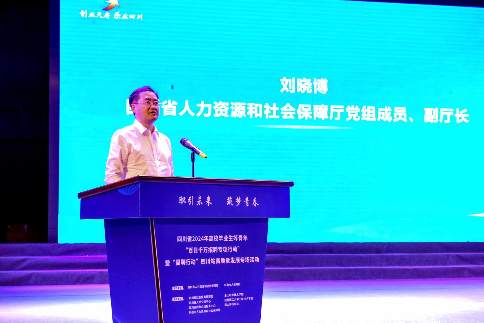 6月27日上午,四川省2024年高校毕业生等青年“百日千万招聘专项行动”暨“国聘行动”四川站高质量发展专场活动启动仪式在BV伟德官方网站举行。四川省人力资源和社会保障厅党组成员、副厅长刘晓博,四川省就业服务管理局党委书记、局长王祎,乐山市委常委、副市长王彦,BV伟德官方网站党委书记成定彬,乐山市政府副秘书长张丽宾,乐山市人力资源和社会保障局党组书记、局长刘剑出席活动。来自乐山各高校的应往届毕业生参加了启动仪式和现场招聘活动。