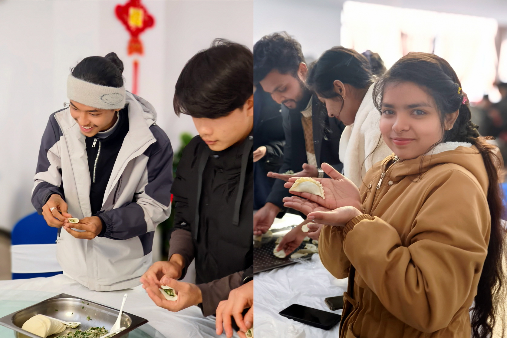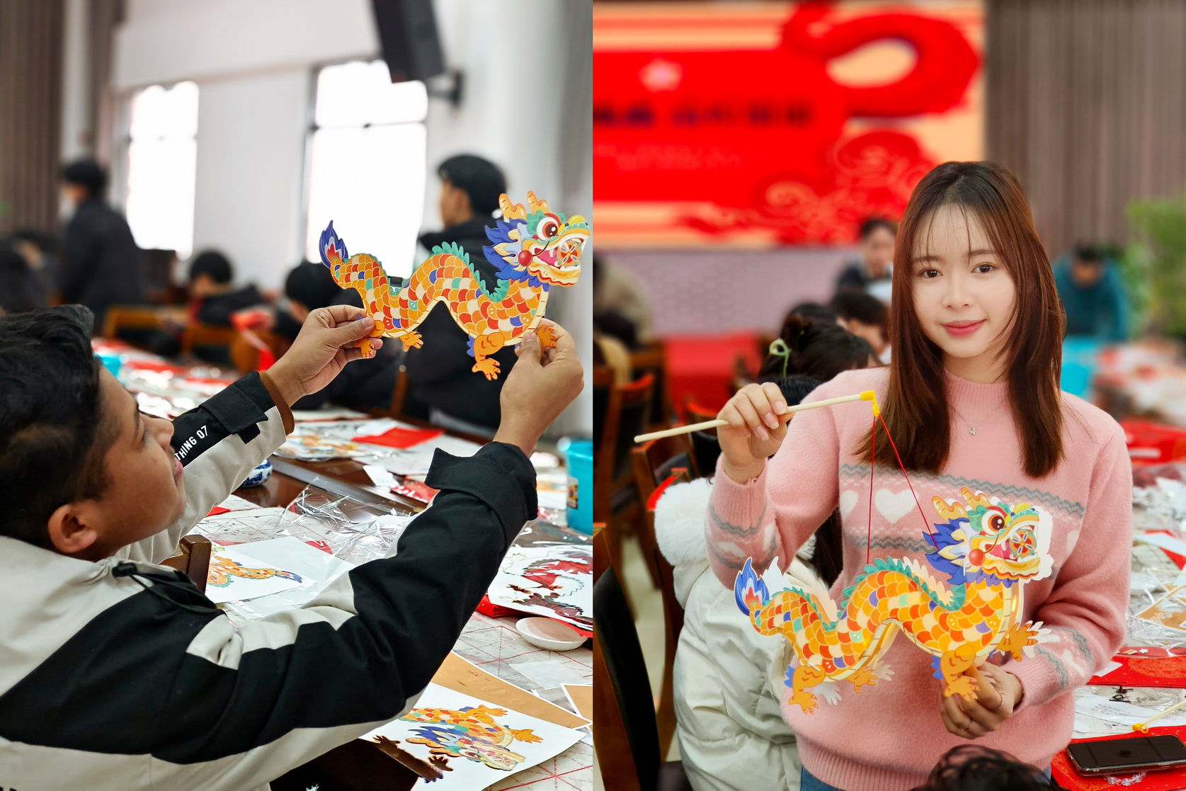 来自老挝、尼泊尔、孟加拉国、塔吉克斯坦、印度尼西亚和越南的78名来华留学生代表在老师们带领下,一起了解中国的春节的来历,听龙的由来。他们与老师共同书写春联、写“福”字,在红色宣纸和墨汁的映衬下,切身感受中国传统文化和浓浓的节日氛围;动手拼装龙灯,做一天“龙的传人”;拓印年画,了解中国的四大发明印刷术,感受中华传统手艺的精神与智慧;包饺子,“饺子谐音‘交子’,象征着新旧交替‘更岁交子’......这是一堂别开生面的感知中国课堂。