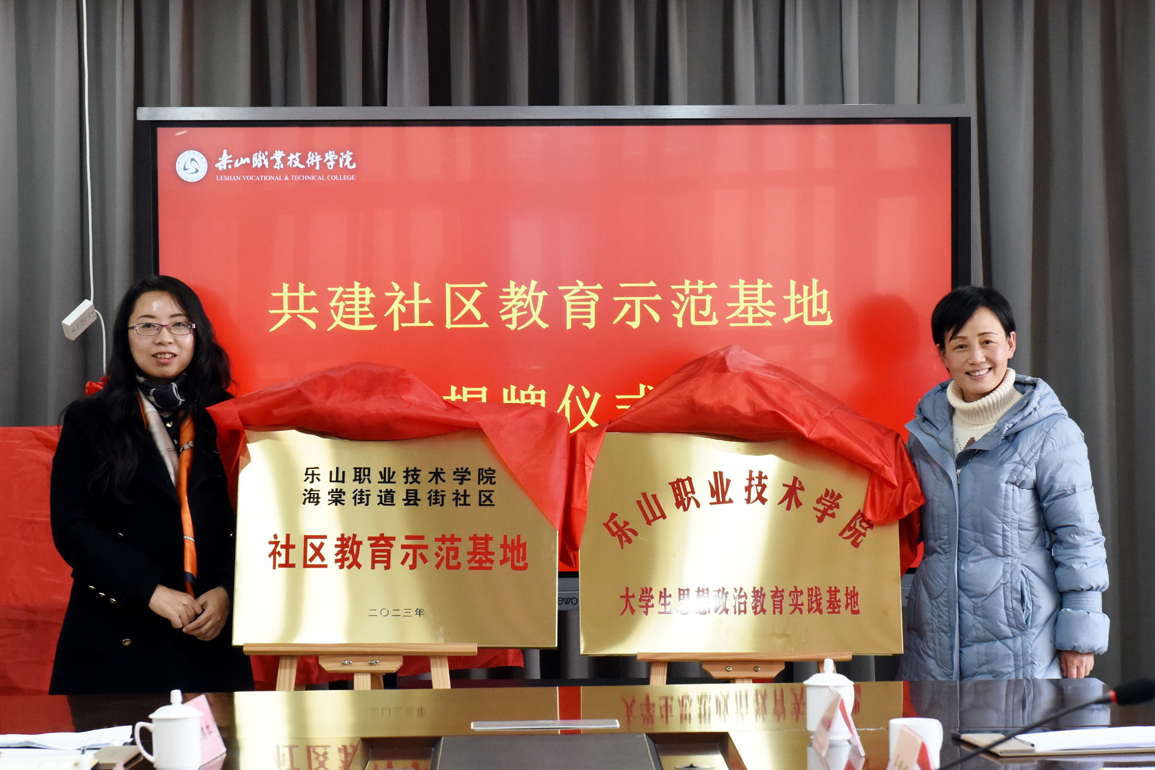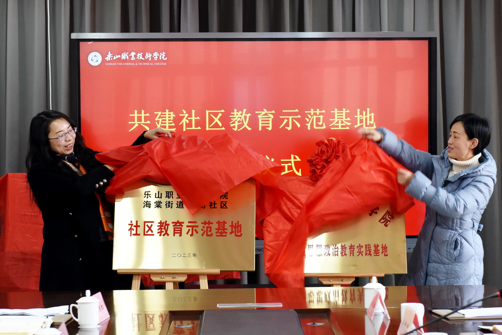仪式上,相关人员介绍了社区教育示范基地筹备情况和运行计划报告,学校分别和海棠街道县街社区、苏稽镇新桥社区签订了共建社区教育示范基地协议,周芹与袁梅、周健分别为两个社区的“社区教育示范基地”和“大学生思政实践基地”揭牌。