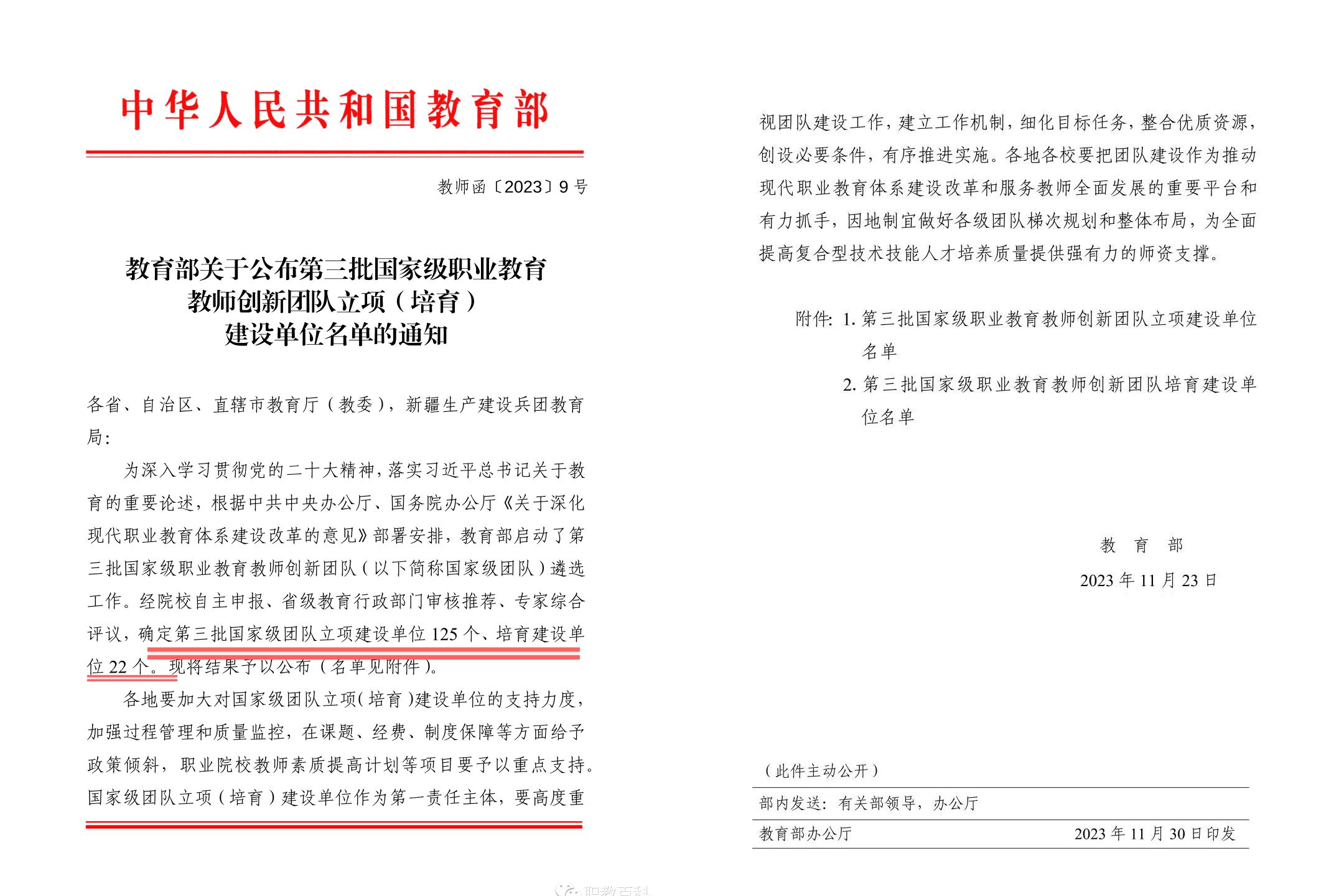 此次入围的国家级团队立项建设单位有125个,BV伟德官方网站是2023年四川省4所入围职业院校之一,也是全省3所拥有2支国家级教师教学创新团队的高职院校之一,此次成功入围,彰显了学校新能源与材料学院教师教学创新团队的强劲实力,可喜可贺。