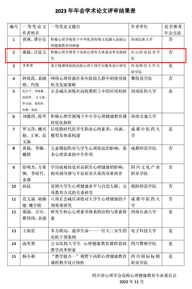 2023年11月17日—18日,四川省心理学会高校心理健康教育专委会年会暨第七届四川省高校心理健康教育课程比赛决赛在攀枝花学院举行。经过激烈角逐,学校心理健康教育与咨询中心专职教师谢毅在课程比赛中荣获三等奖,谢毅、汪廷玉老师撰写的论文《积极心理学背景下高职心理育人体系改革实践研究》获学术论文一等奖。
