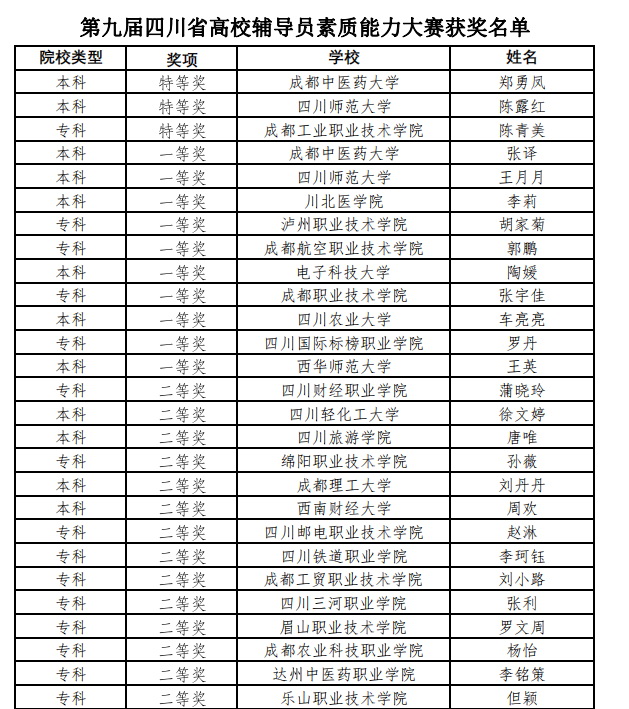 11月3日—5日,四川省高校辅导员素质能力提升骨干训练营暨第九届全省高校辅导员素质能力大赛决赛在成都中医药大学举行。经过两天的激烈角逐,BV伟德官方网站辅导员但颖老师凭借着扎实的理论水平和专业的业务能力脱颖而出,荣获二等奖。