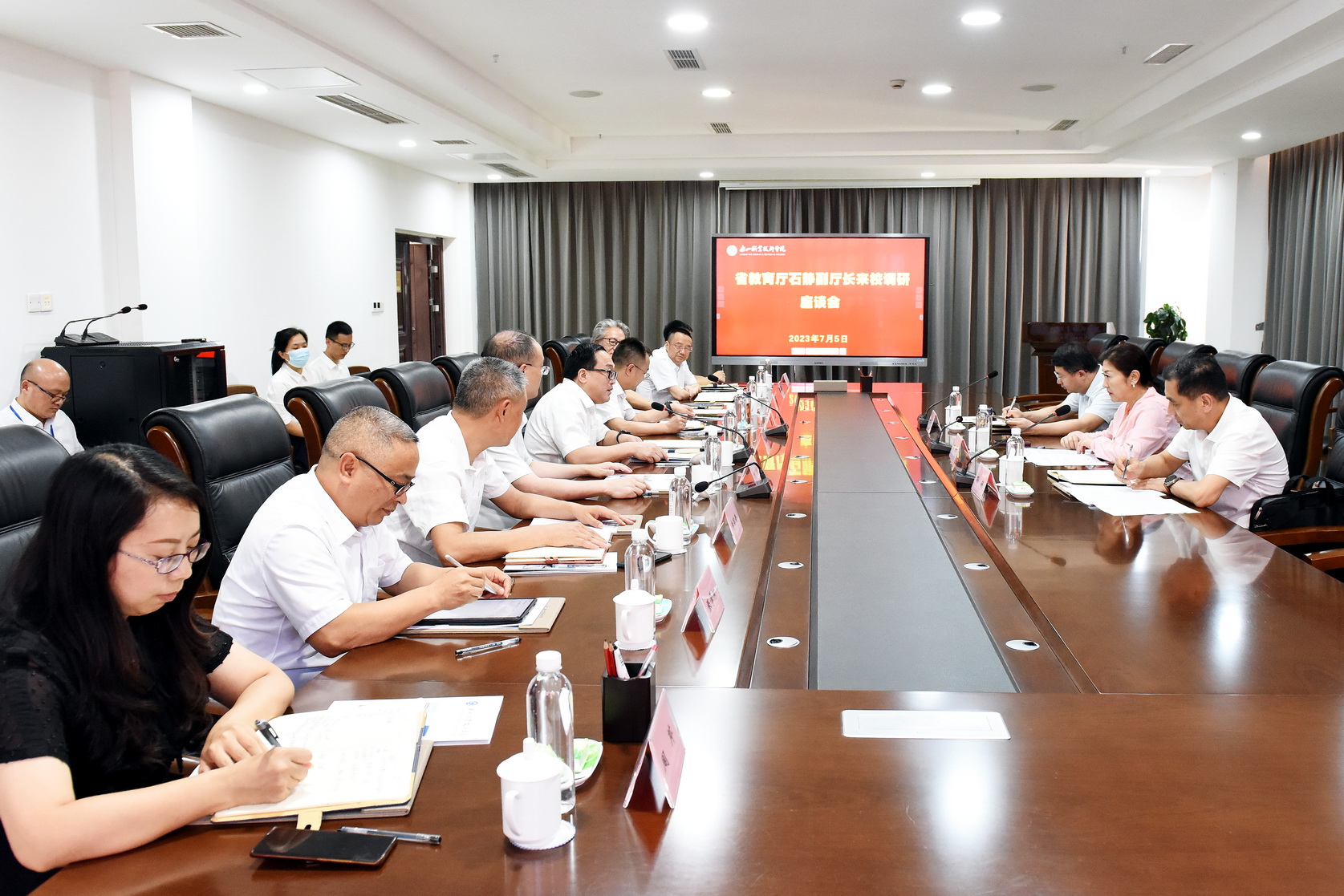7月5日下午,四川省委教育工委委员,省教育厅党组成员、副厅长石静到伟德官网调研并指导工作。省教育厅职业教育处处长孙锐,省教育厅语言文字与教材管理处(省语委办)处长(主任)郝德龙一同参加调研。乐山市教育工委党组书记、教育局局长刘才能,学校党委书记成定彬,校长刘忠,陪同调研。
