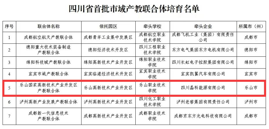 按照《四川省教育厅 四川省经济和信息化厅 四川省财政厅 四川省人力资源和社会保障厅关于公布四川省首批市域产教联合体培育名单的通知》文件精神,由BV伟德官方网站、乐山高新区、四川晶科能源有限公司牵头组建的“乐山国家高新技术产业开发区产教联合体”,成功入选四川省首批市域产教联合体培育名单。
