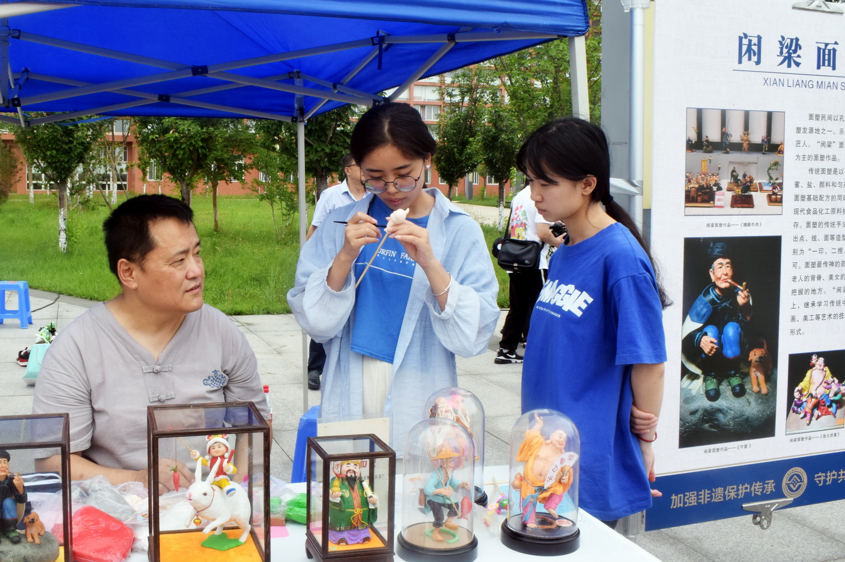 活动还组织了夹江年画、峨眉扎染、闲梁面塑、“伟老汉”小米米花糖、“古真记”钵钵鸡、太平豆腐干6个非遗项目及其传承人,现场开展非遗项目展示及体验活动。师生亲自参与项目体验,近距离感受乐山非遗魅力。