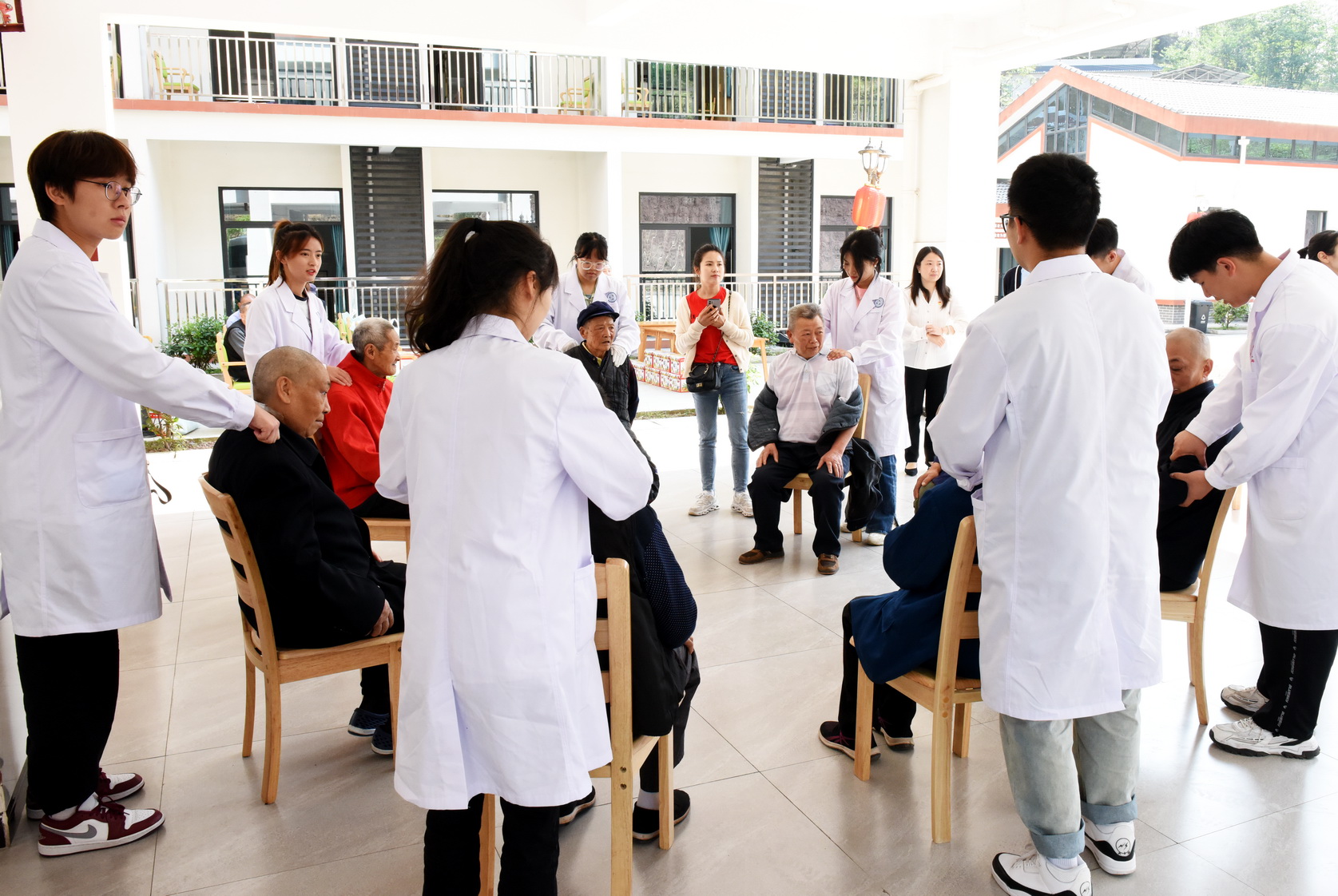 中医康养学院教师为老人普及了常见病、多发病防治健康知识,学生志愿者为老人推拿,得到了老人的赞许。