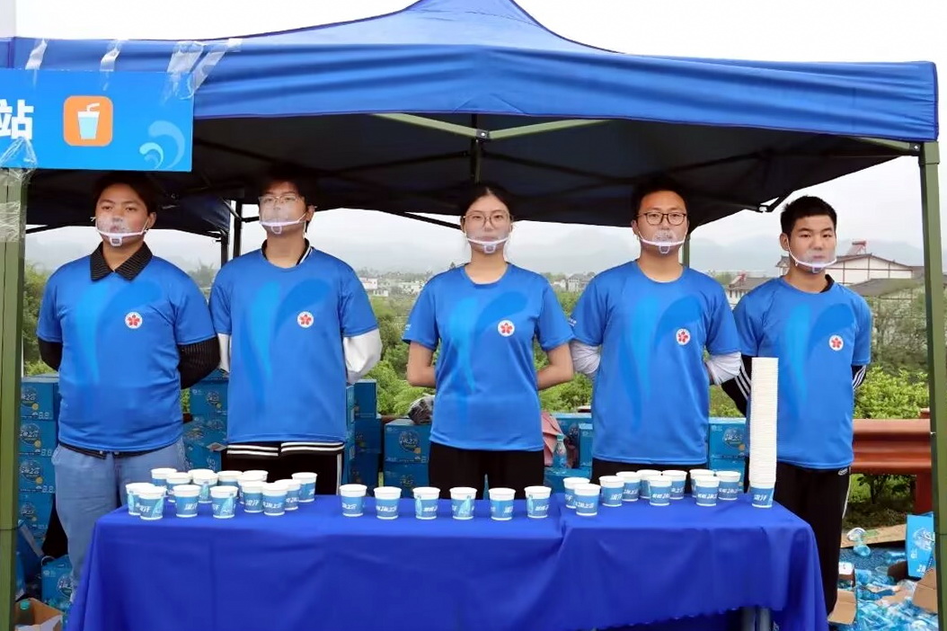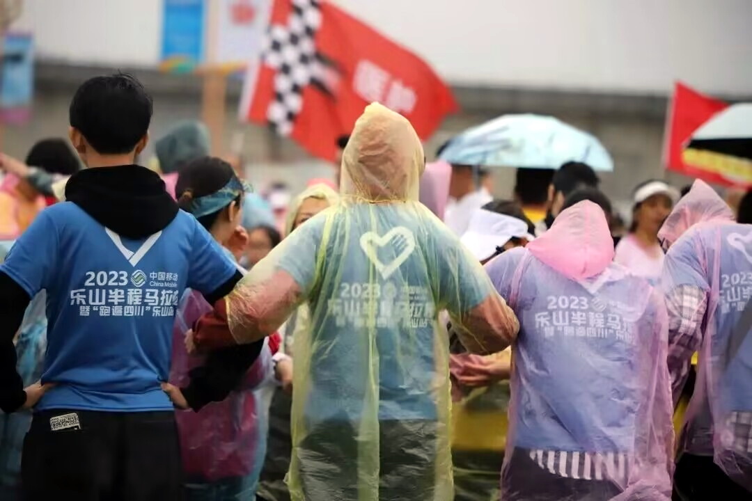 志愿者穿着各色雨衣齐心协力、分工明确,有序完成物资清点,协助安保人员完成现场帐篷维护,快速完成补给站物品摆放等工作。