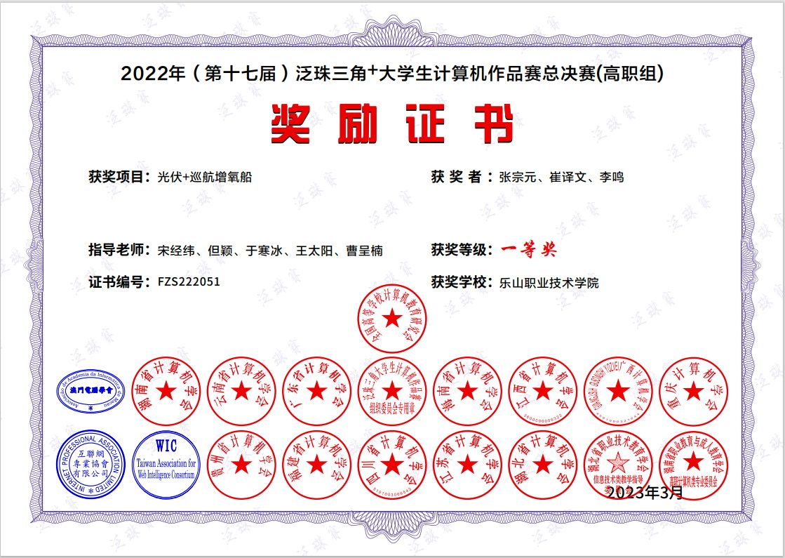 近日,由全国高等学校计算机教育研究会及泛珠三角大学生作品赛组委会主办的第十七届“泛珠三角+大学生计算机作品赛总决赛”在澳门理工学院顺利落下帷幕。伟德官网学生张宗元、崔译文、李鸣的参赛作品《光伏+巡航增氧船》(指导老师:宋经纬、但颖、于寒冰、王太阳、曹呈楠)喜获全国一等奖。