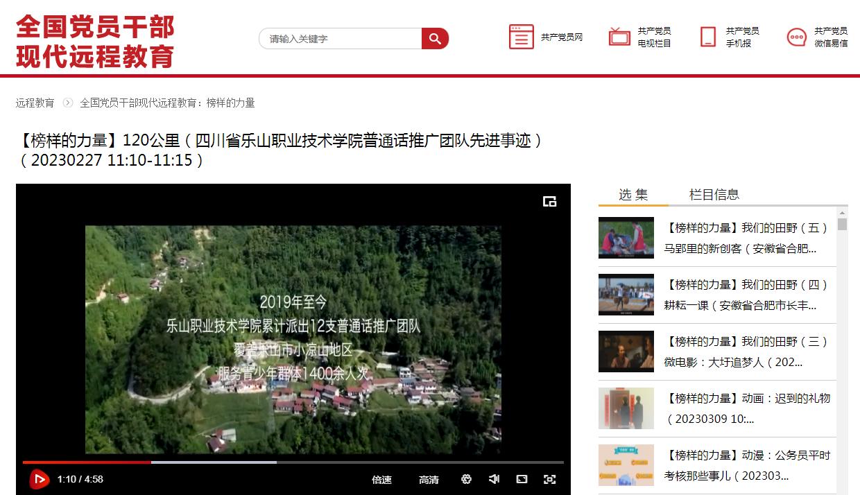 2022年11月初,根据市委组织部有关要求,学院组织人事部认真梳理,结合学校实际,向各级党组织广泛征集关于思政课、文旅课、信息产业课等题材的视频课件,经层层筛选,向市委组织部推荐上报了由学院党委宣传部监制、学生工作部创作的短视频《120公里》(四川省BV伟德官方网站普通话推广团队先进事迹),经省市审查后,推荐至中组部。2023年2月底起,该短视频在共产党员网全国党员干部现代远程教育“榜样的力量”专栏展播。