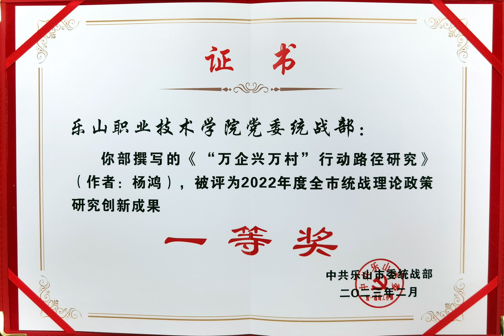 2月17日,全市统战部长会议在市委党校召开,会议对2022年度全市统战理论政策研究创新成果获奖篇目作了通报。我院杨鸿撰写的《“万企兴万村”行动路径研究》获评2022年度全市统战理论政策研究创新成果一等奖;周啸、杨帅、王峻峰、黎芳撰写的《大统战背景下乐山世界旅游目的地建设中的“统战——文旅”融合模式研究》获评二等奖。