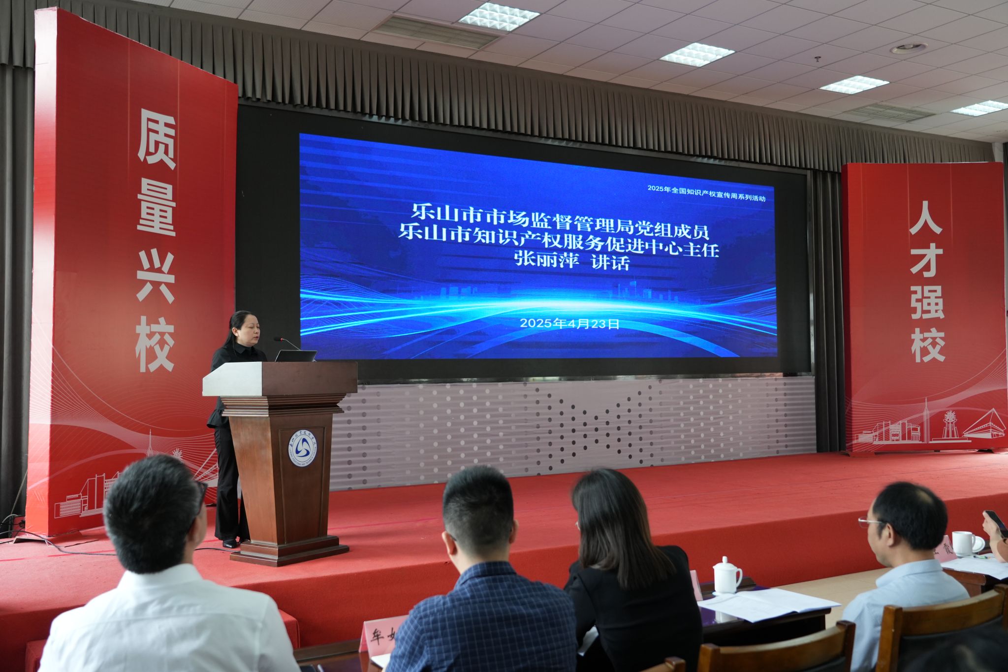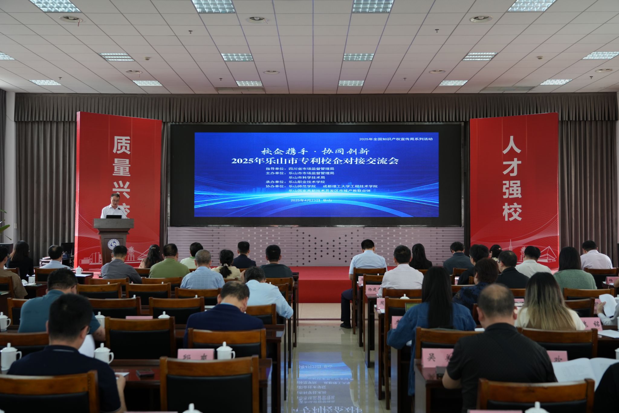 4月23日,由四川省市场监督管理局指导,乐山市市场监督管理局、乐山市科学技术局主办,BV伟德官方网站承办、乐山国家高新技术产业开发区产教联合体协办的 “校企携手・协同创新” 乐山市知识产权校企对接交流会在BV伟德官方网站顺利举行。此次活动作为2025年全国知识产权宣传周系列活动的重要组成部分,旨在搭建校企合作桥梁,推动专利转化运用,助力科技创新与产业升级。来自省、市相关部门领导、高校专家学者、企业代表等150余人参加会议。