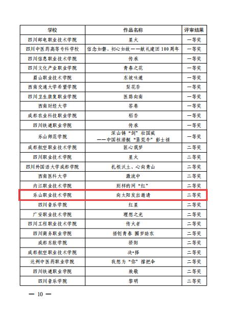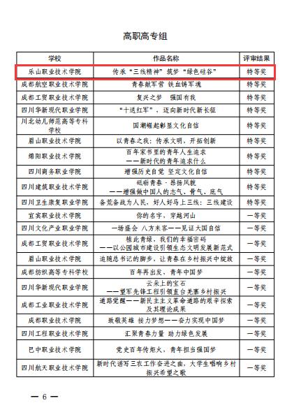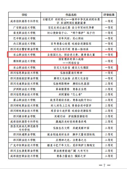 旅游系学生曹佳颖、电信系学生邓仁贤团队主讲,马院教师徐红梅团队指导的《传承“三线精神”筑梦“绿色硅谷”》获得特等奖;医护系学生黄昕月主讲,马院教师刘倩团队指导的《立报国之志,担奋进之责,展青春之翼》获得一等奖;医护系学生黎豇岚主讲,马院教师邓加强团队指导的《坚定文化自信 建设文化强国》获得一等奖;旅游系学生王月娥主演,马院教师石红英团队指导的微电影《彝寨里的索玛花》获得一等奖;医护系学生周羿鑫主演,马院教师团队指导的微电影《向太阳发出邀请》获得二等奖。