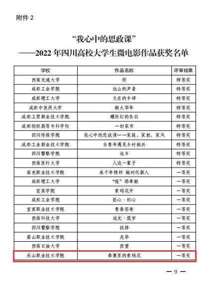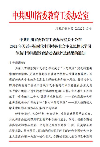 近日,四川省委教育工委组织的“青春献礼党的二十大 强国有我新征程”——第六届高校大学生讲思政课公开课展示和“我心中的思政课”——第六届高校大学生微电影展示作品征集和评选活动评选结果公布,BV伟德官方网站报送的5个参赛作品分别获得特等奖1个、一等奖3个、二等奖1个,学院荣获“优秀组织高校”称号。