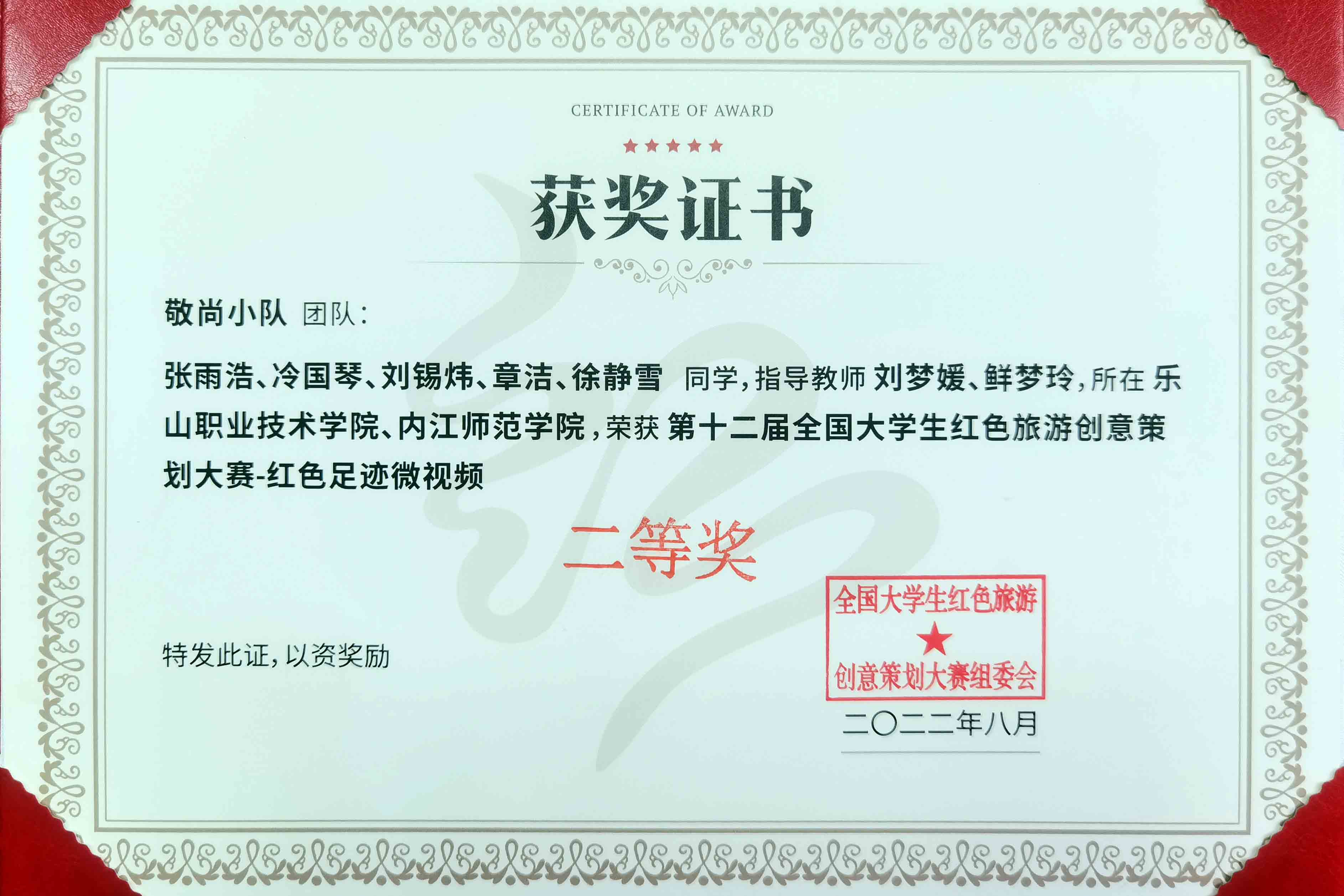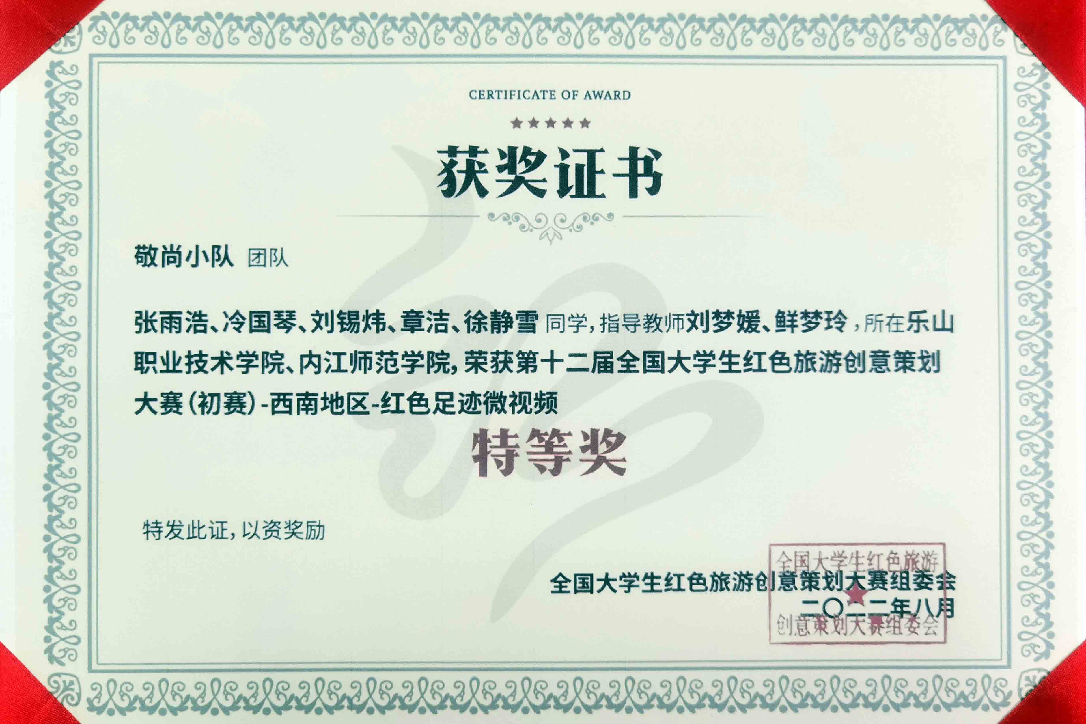 “敬尚小队”由BV伟德官方网站旅游系旅游管理专业2021级学生张雨浩、冷国琴、刘锡炜、徐静雪,内江师范学院体育教育专业2021级学生章浩5名同学组成,在旅游系刘梦媛、鲜梦玲及马克思主义学院刘晓锐等老师的指导下,从今年7月初开始备赛,经历了“讨论策划→制定方案→视频脚本→延安采风→后期制作→完善资料→答辩排练”等过程,8月中旬形成了完整的参赛作品《勠力同心播火种 抗大精神在延安》微视频,在西南赛区“红色足迹微视频”赛道组荣获“特等奖”并进入全国总决赛。在全国总决赛中,最终取得“第十二届全国大学生红色旅游创意策划大赛-红色足迹微视频”二等奖的优异成绩,刘梦媛、鲜梦玲老师获得“最佳指导教师奖”的殊誉。