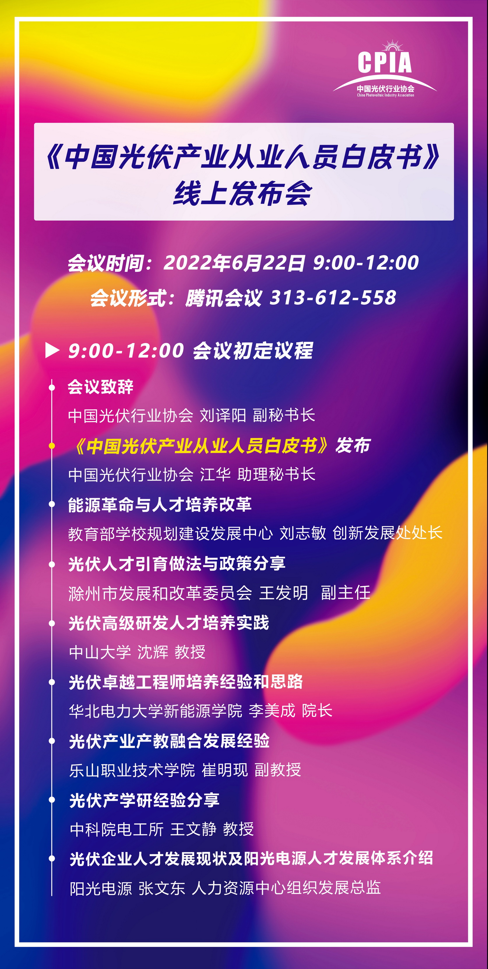 2022年6月22日,由中国光伏行业协会主办的《中国光伏产业从业人员白皮书》线上发布会顺利召开,来自全国光伏行业企业和院校的150余名专家代表参加了会议。