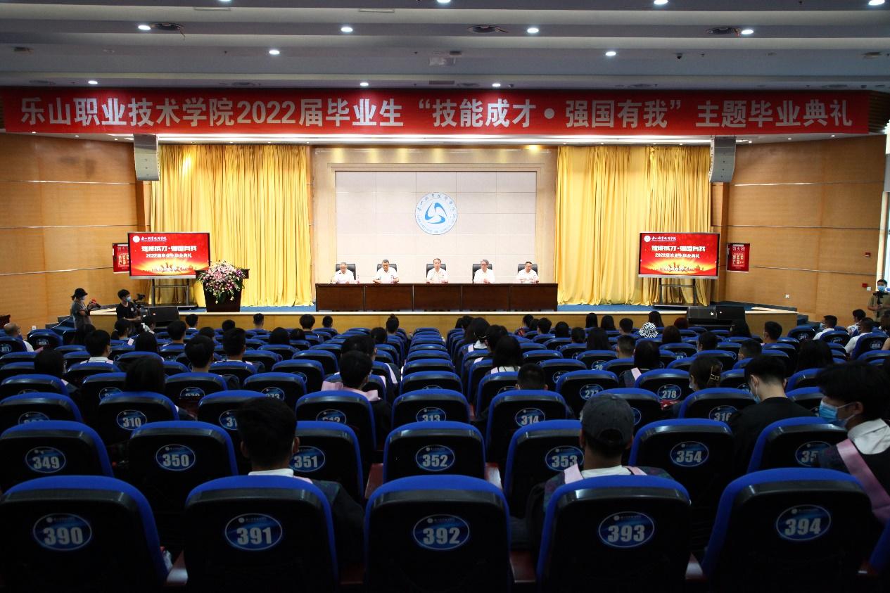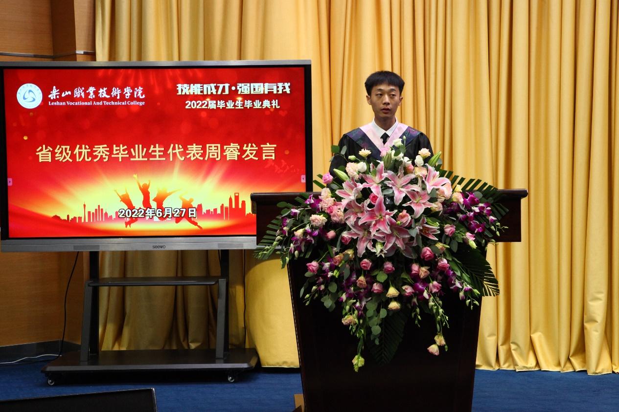 典礼上,学院副院长陈元进宣读了《关于公布2022届四川省级优秀大学毕业生认定结果的通知》,我院共有140余名同学获此殊荣。8名省级优秀大学毕业生代表上台从全体院领导手里接过荣誉证书,也接过了一份独属“乐职学子”的光荣传承。